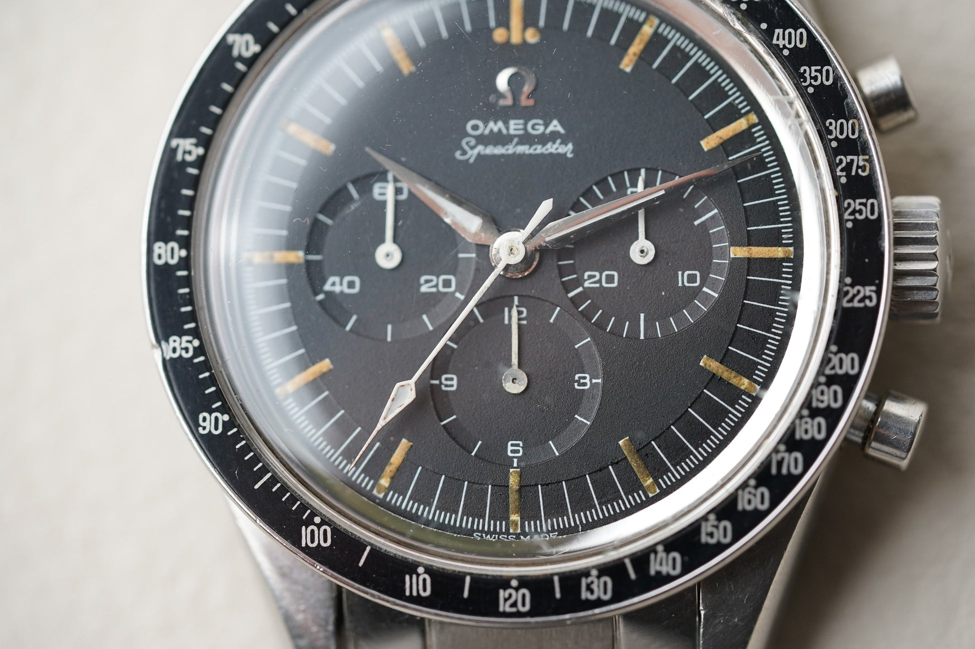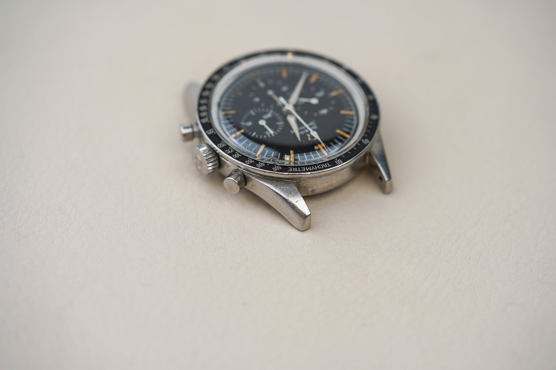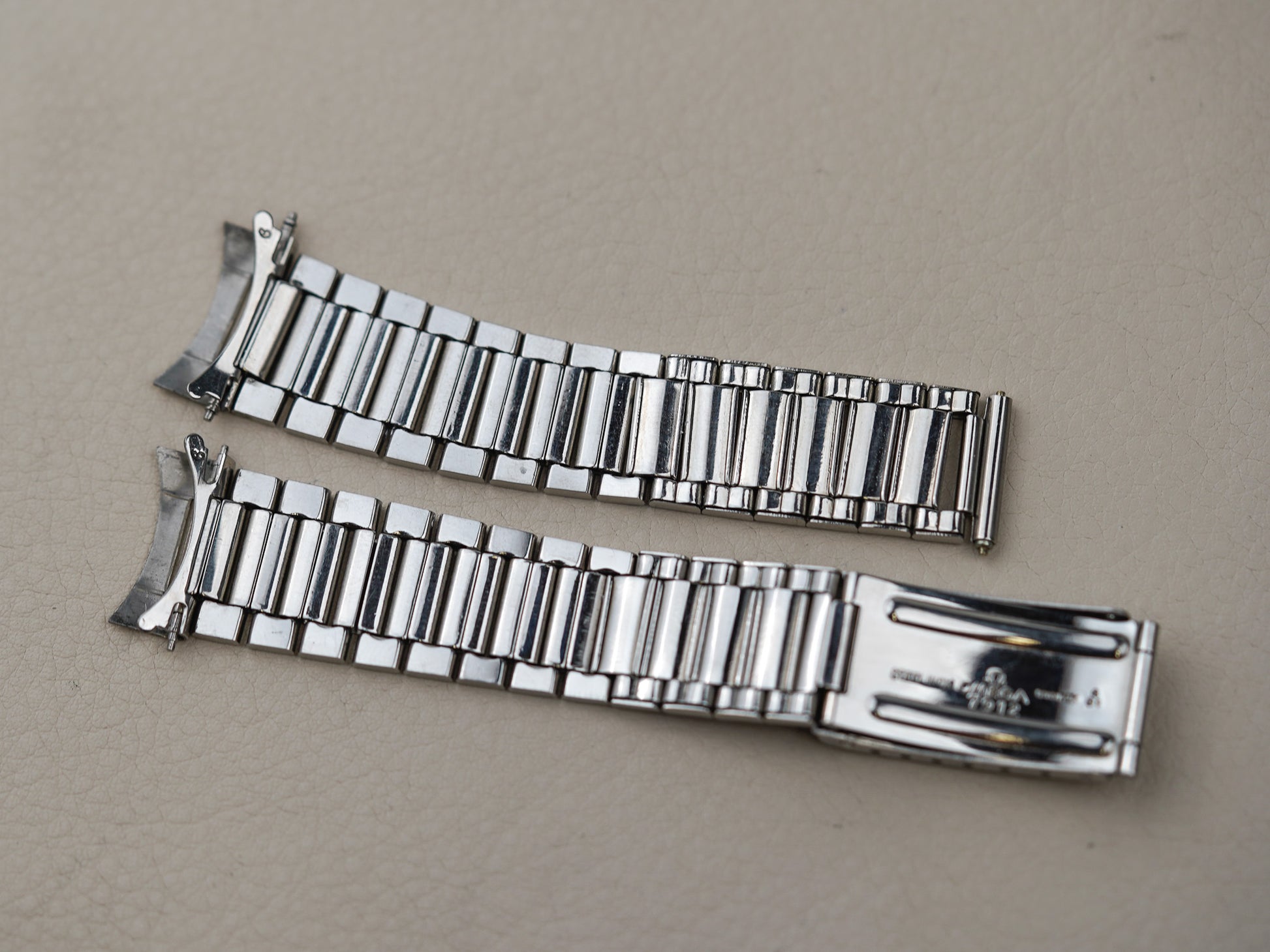 Inside the watch is the legendary Omega Calibre 321, a manual-winding column-wheel chronograph movement developed by Lemania and widely regarded as one of the finest chronograph calibres ever produced. The movement powers the classic tri-compax chronograph layout—small seconds at 9 o’clock, a 30-minute counter at 3 o’clock, and a 12-hour counter at 6 o’clock—and offers around 44 hours of power reserve. The watch was originally fitted with a hesalite crystal and typically paired with period-correct Omega flat-link bracelets such as the reference 7912.