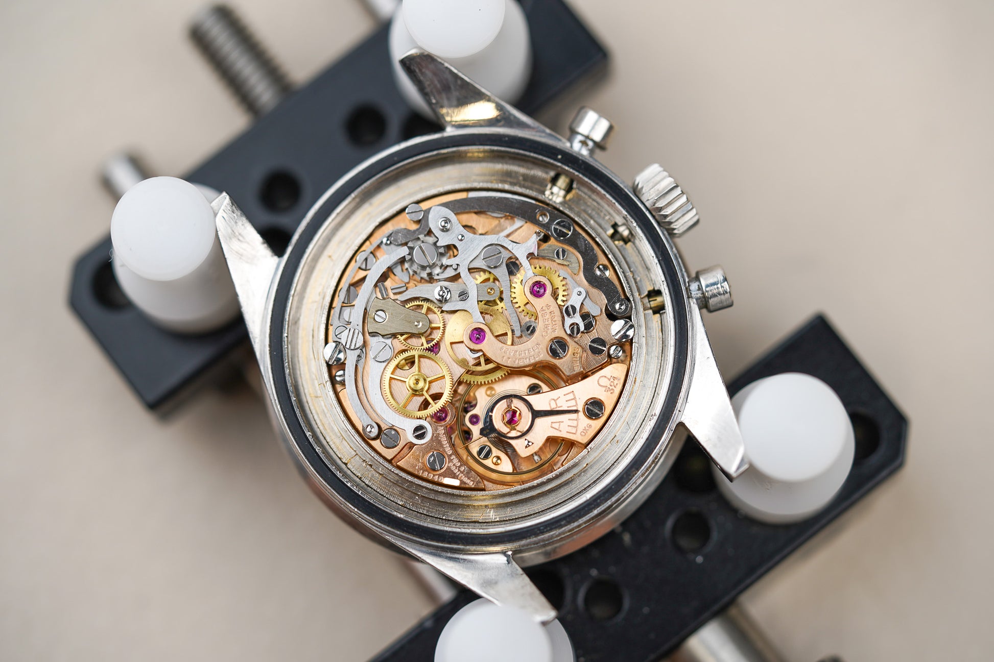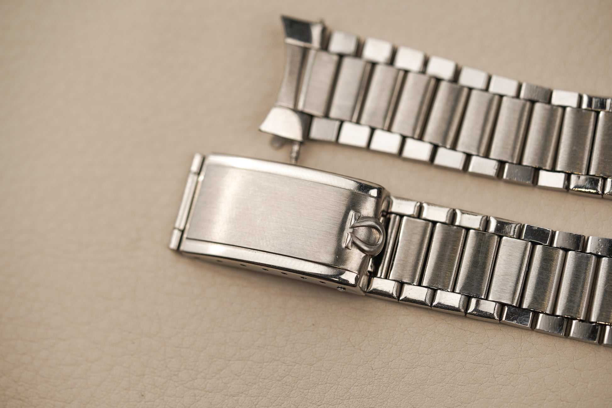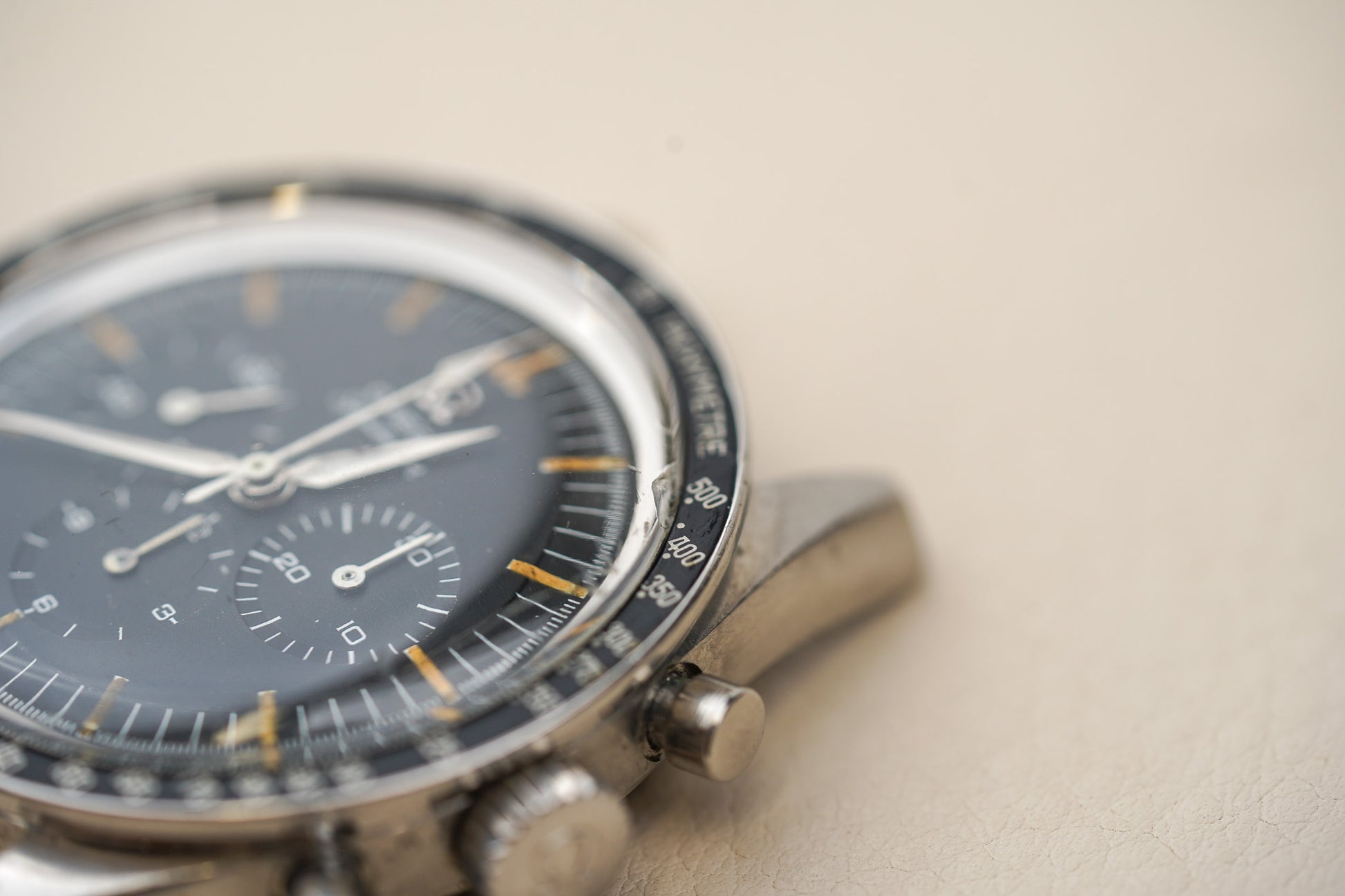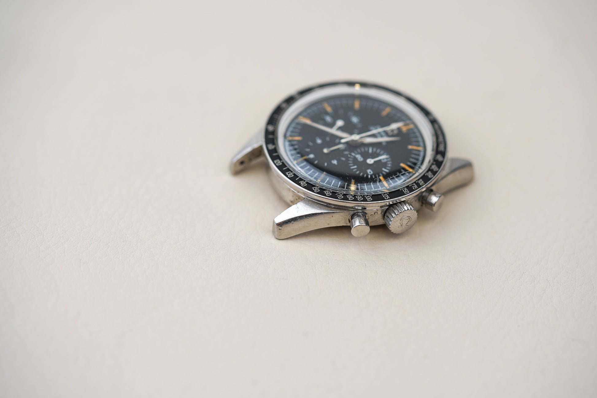 Inside the watch is the legendary Omega Calibre 321, a manual-winding column-wheel chronograph movement developed by Lemania and widely regarded as one of the finest chronograph calibres ever produced. The movement powers the classic tri-compax chronograph layout—small seconds at 9 o’clock, a 30-minute counter at 3 o’clock, and a 12-hour counter at 6 o’clock—and offers around 44 hours of power reserve. The watch was originally fitted with a hesalite crystal and typically paired with period-correct Omega flat-link bracelets such as the reference 7912.
