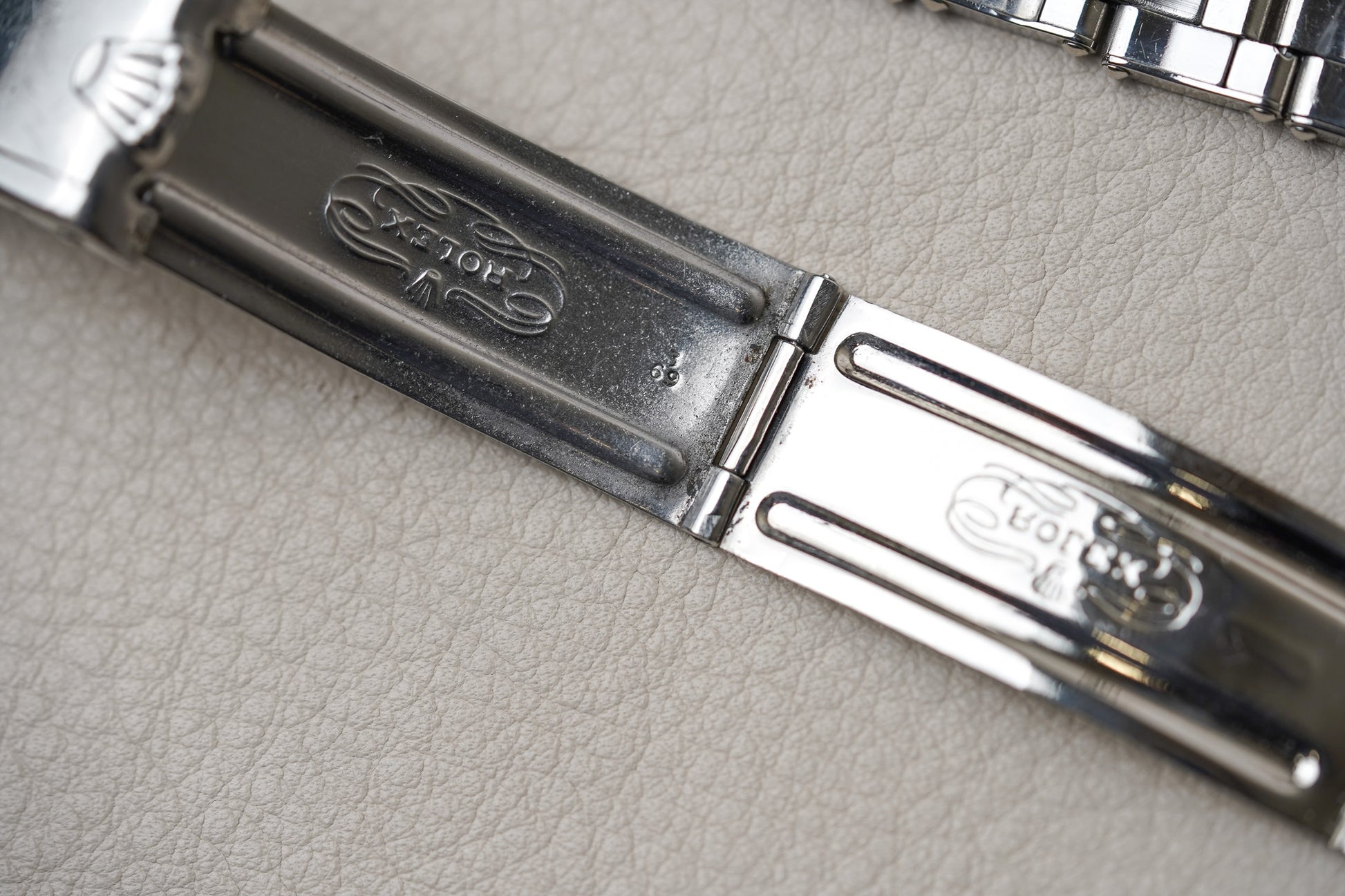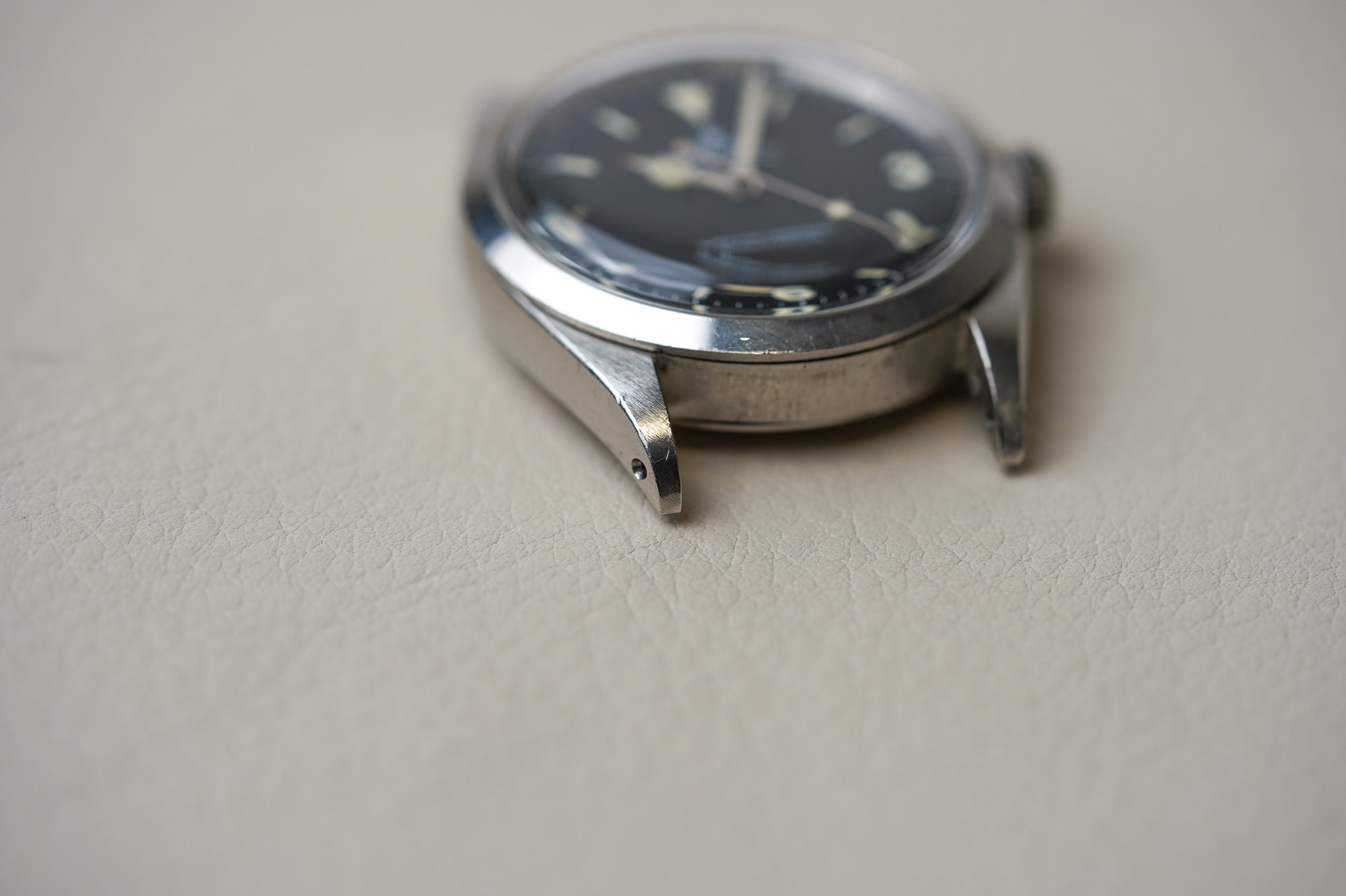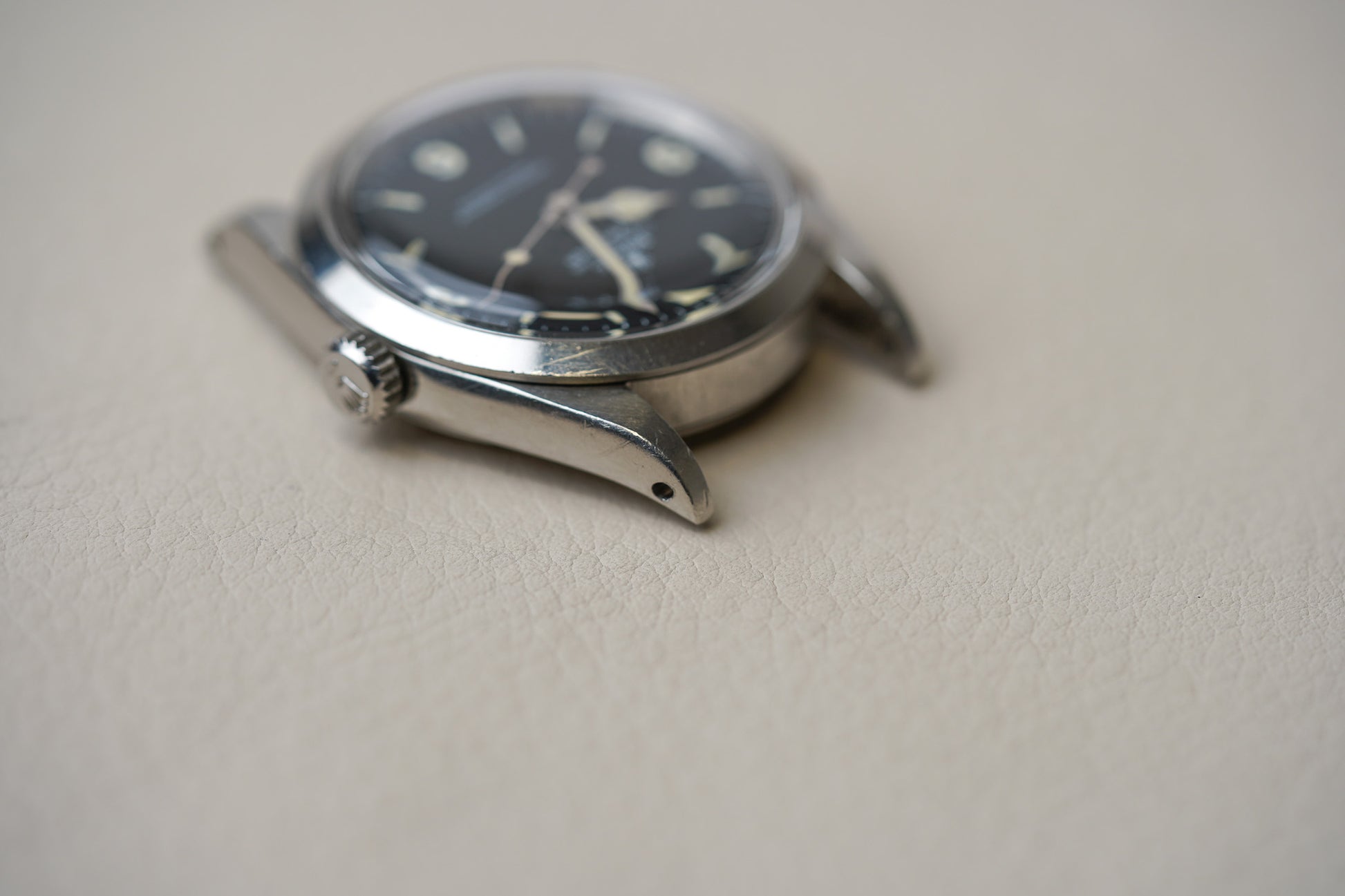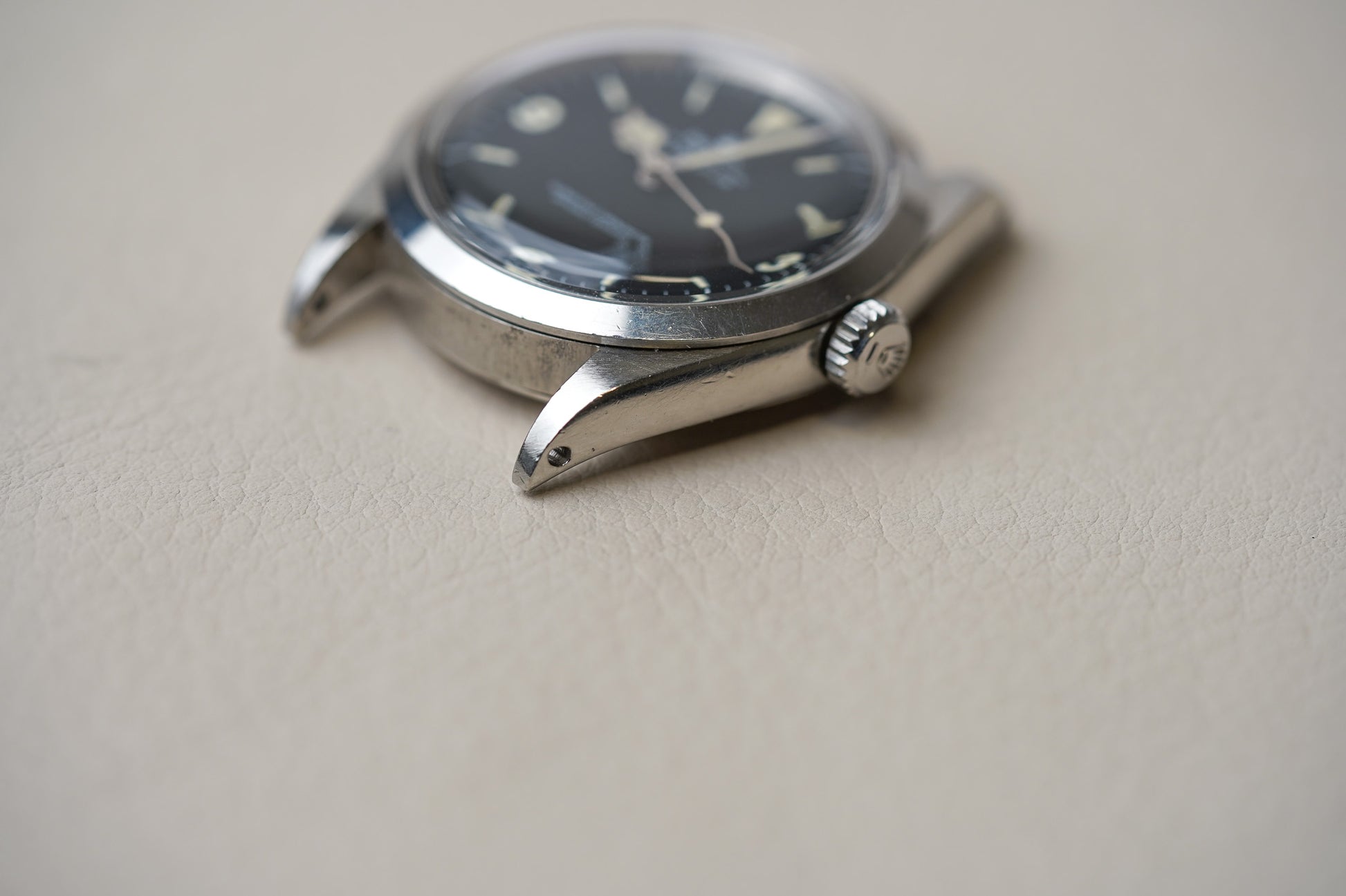 Featuring a 36mm diameter Oyster case with smooth bezel and acrylic dome crystal and with a very pleasing original matte black Mark 1 dial with gently aged tritium lume plots and color matched hands. The hands have been professionally restored with non UV glow tritium lume to match the color of the dial plots. The Mark 1 dial is also referred to as the “Frog’s feet” dial due to the irregular shape of the Rolex crown logo. With corresponding case back date code of IV/67.