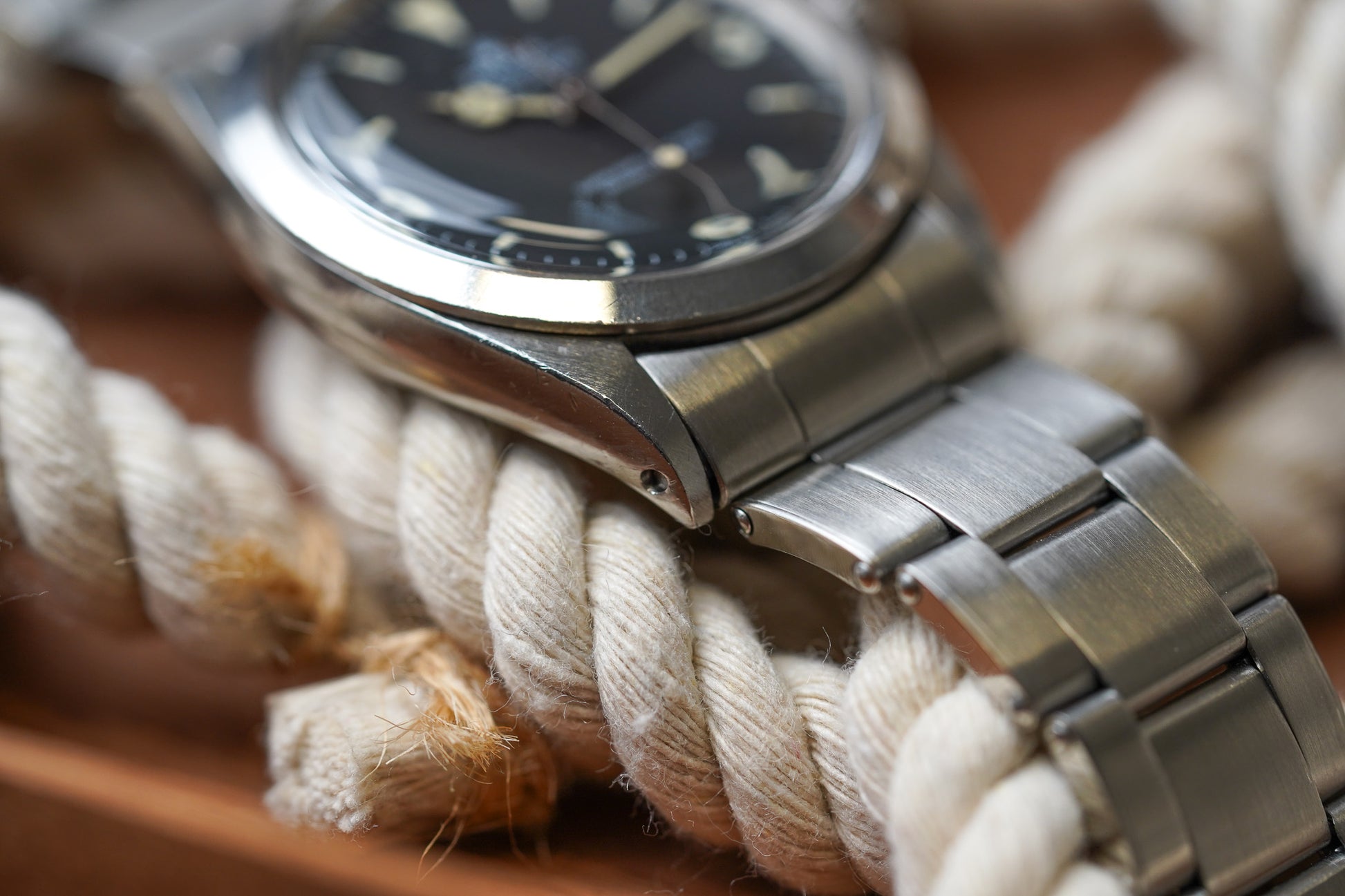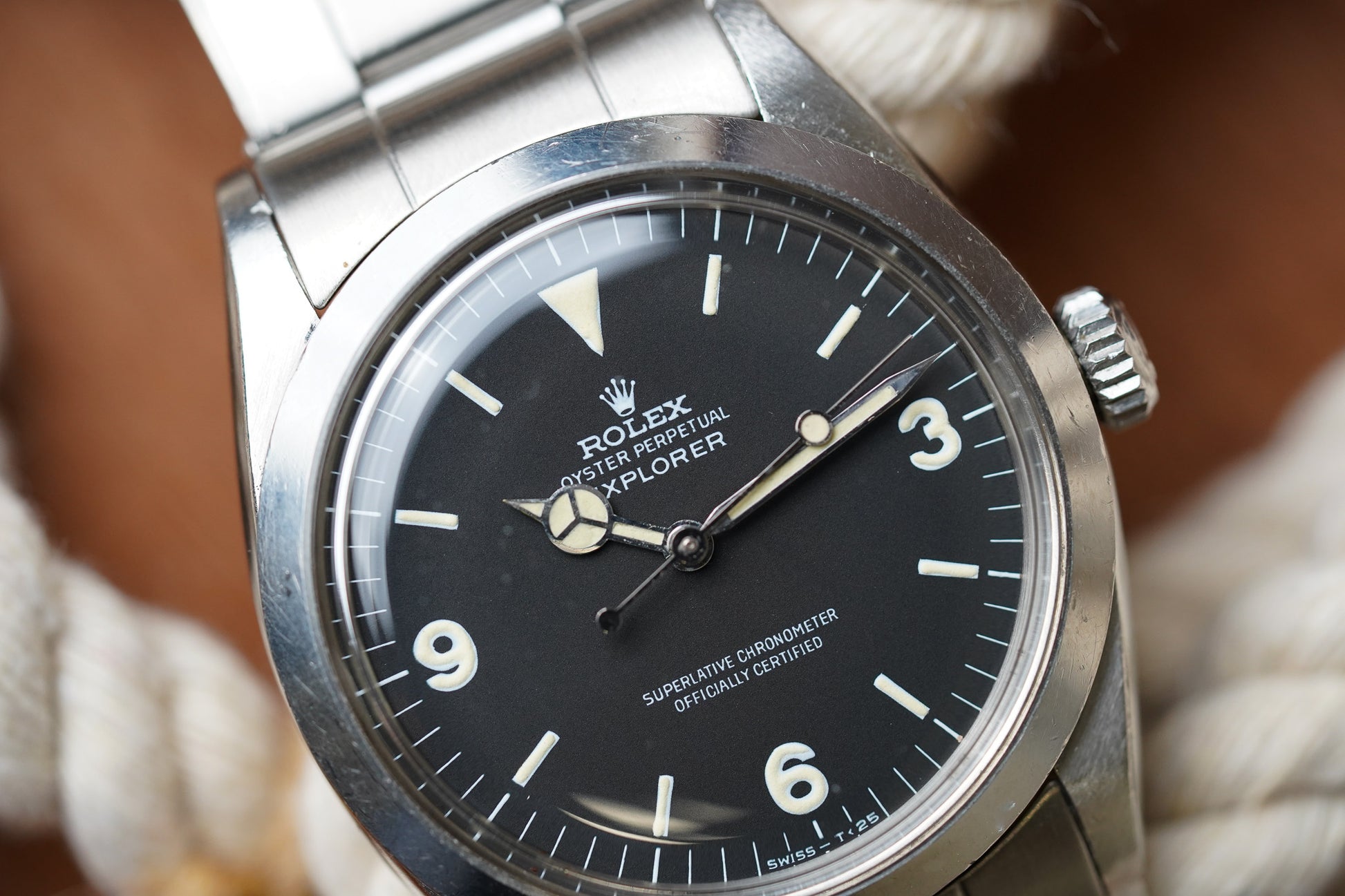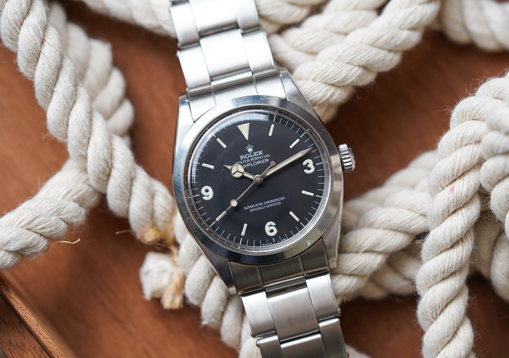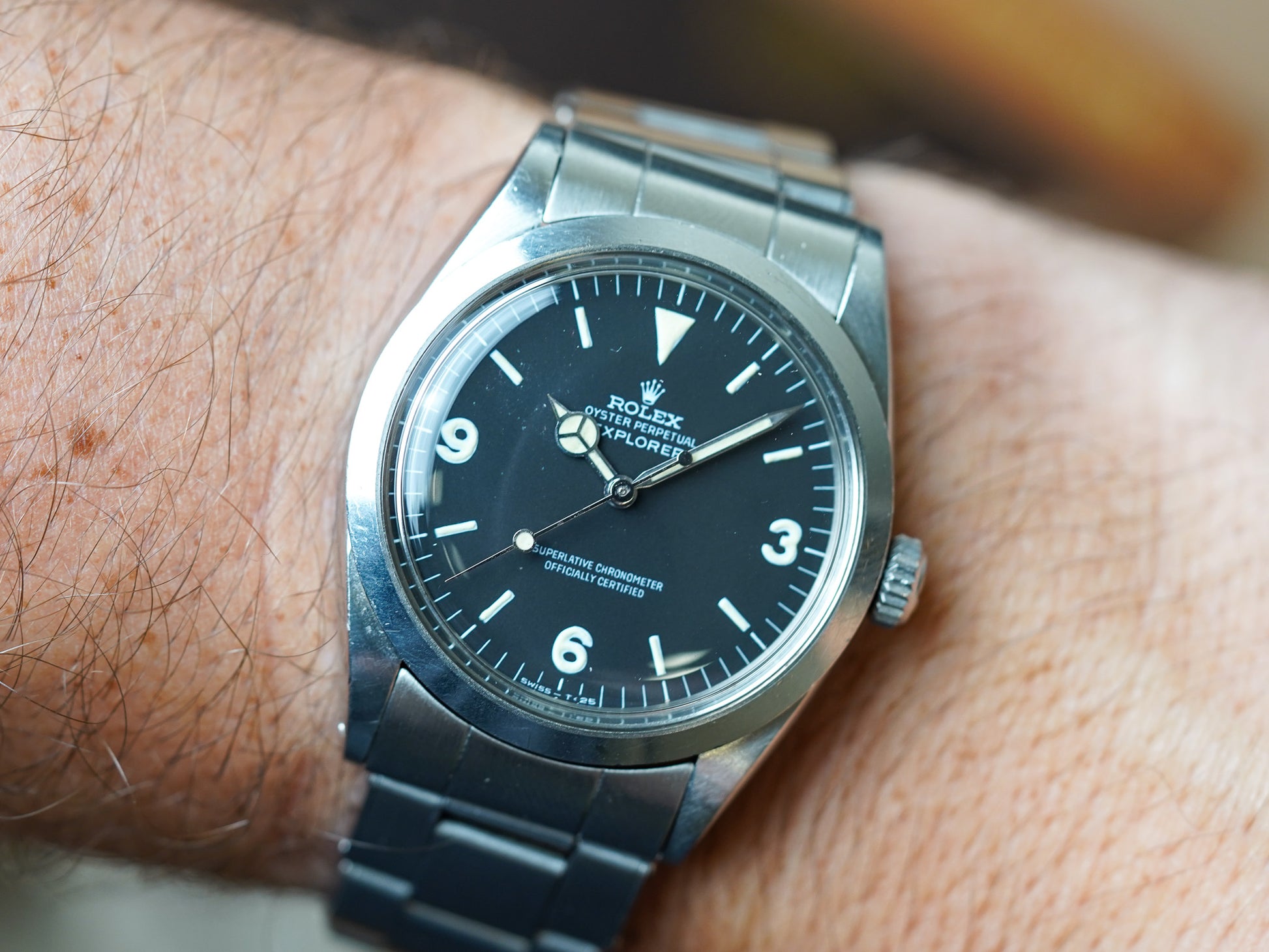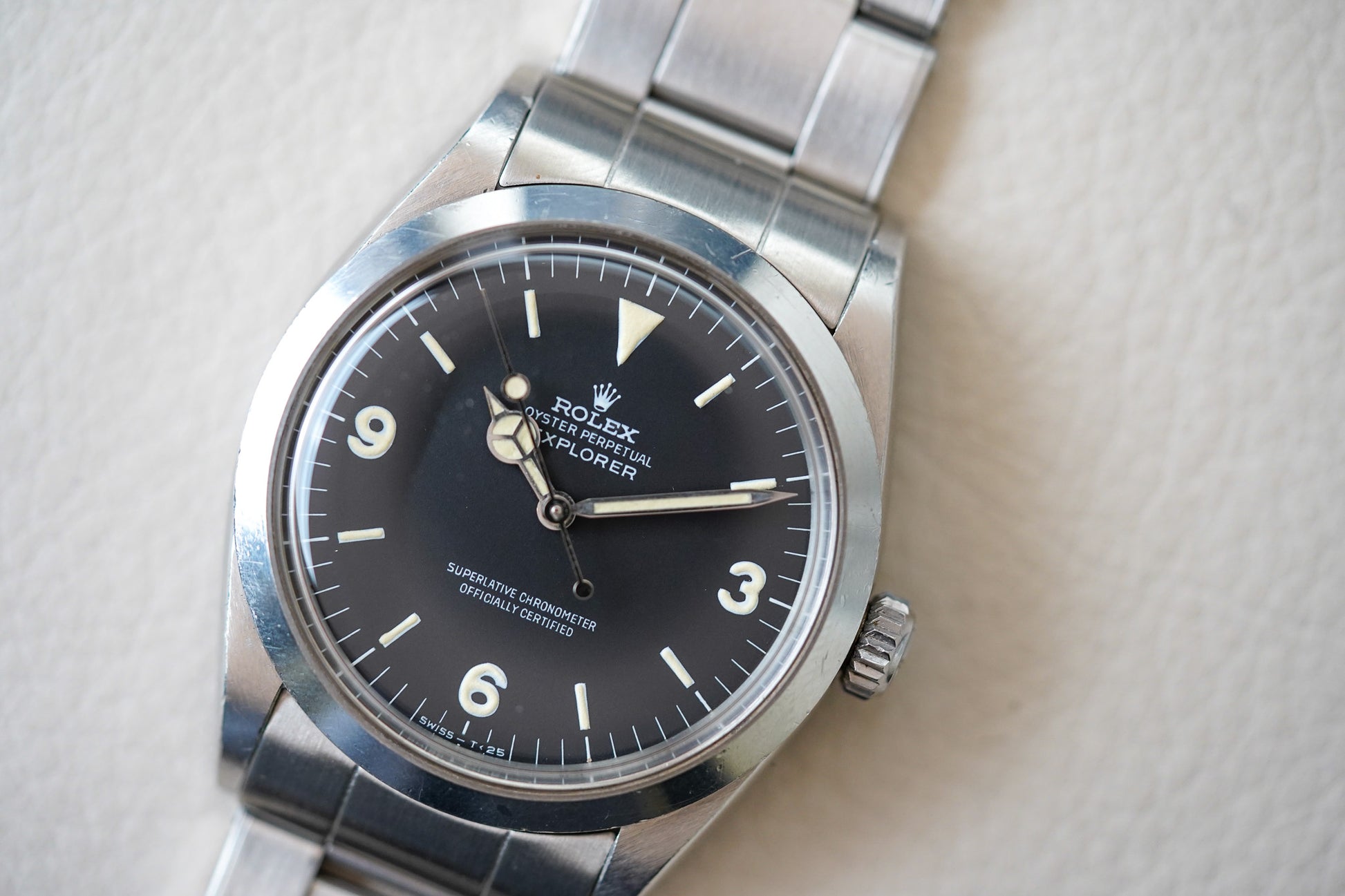The current example is a very pleasing example with the perfect vintage look. The matte dial surface is clean and without damage, hand drag, or scratches. The lume plots are all original and unmolested.The hands have been professionally restored with non UV glow tritium lume to match the color of the dial plots In all respects an extremely pleasing example vintage Explorer 1 model. Case has light normal wear with nothing notable. Third party servicing 01/03/2024. Bracelet has hardly any stretch with normal light wear.