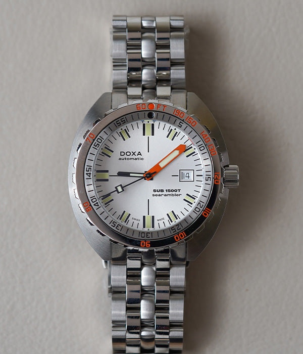 Its cushion-shaped case is made of 316L stainless steel of the highest quality. With a diameter of 45 mm, the SUB 1500T is rated at 150 ATM for dives at depths up to 1,500 meters. Paying tribute to the SUB 300T Conquistador, it features the same patented unidirectional rotating bezel and integrated helium relief valve as its legendary predecessor. All the elements that provide dive mission-critical information are equipped with a Super-LumiNova® luminescent coating to ensure optimum legibility underwater. The bracelet is 316L stainless steel and features a folding clasp with the DOXA fish symbol.