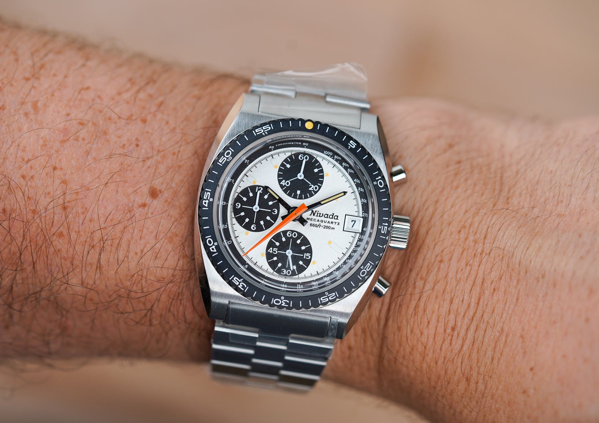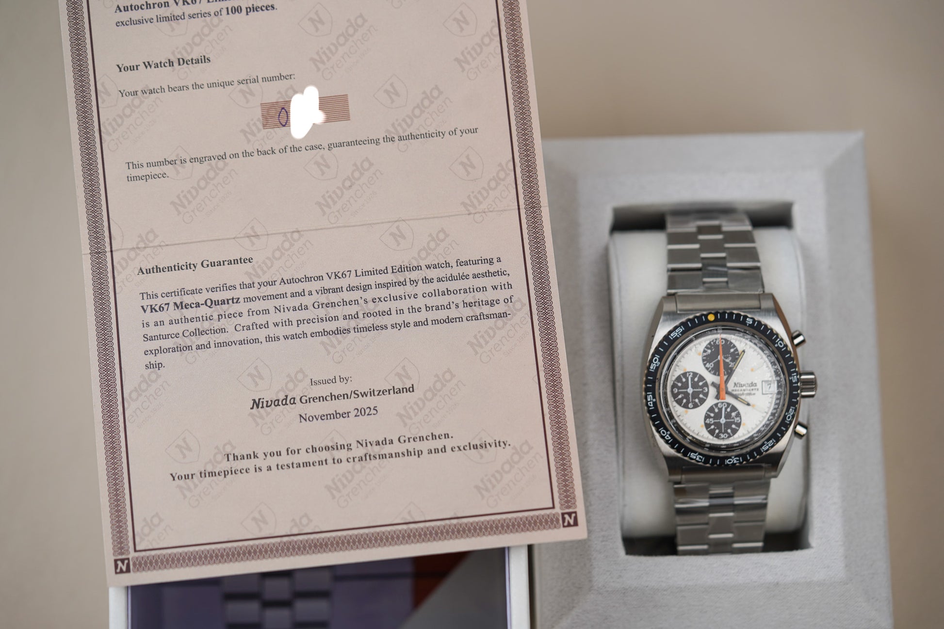 The Nivada Grenchen Autochron Panda x Santurce Co Ref. 77003Q45 is a modern, vintage-inspired chronograph created through a collaboration between Nivada Grenchen and the Santurce Watch Club, blending 1970s motorsport aesthetics with contemporary technology. The watch stands out with its classic “panda” dial configuration—a white dial paired with contrasting black sub-dials—evoking legendary racing chronographs of the era while offering a clean, highly legible layout. The design channels retro racing style with a tachymeter scale, bold hands, and contrasting registers, giving it a look often compared to vintage racing chronographs from the late 1960s and 1970s.
