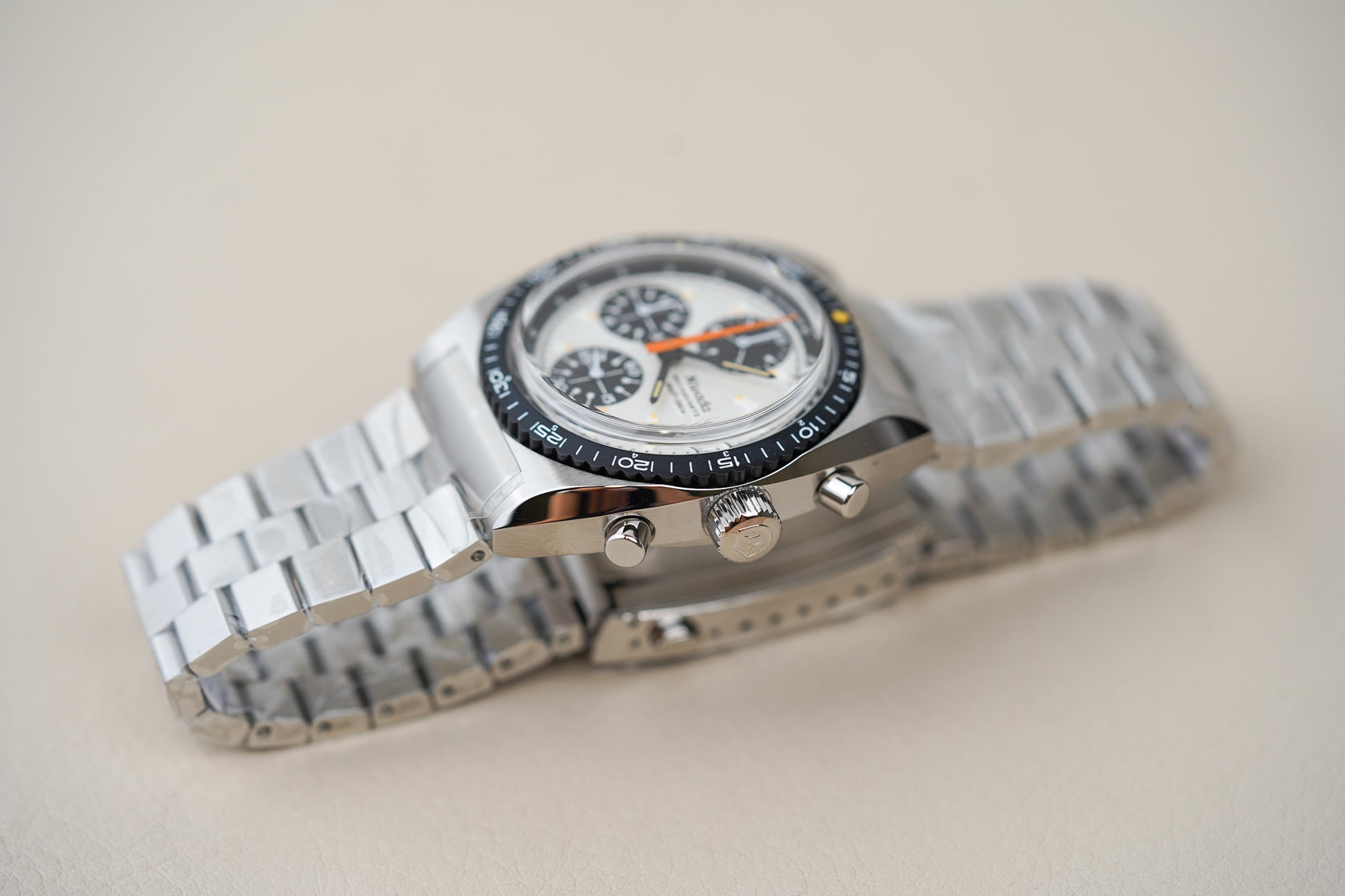 Built in a 38 mm stainless-steel case with a double-domed sapphire crystal, the Autochron Panda balances vintage proportions with modern durability. It uses a TMI VK67 meca-quartz chronograph movement, combining quartz timekeeping accuracy with a mechanical chronograph module that provides crisp push-button action and smooth chronograph operation. The watch also offers 200 m water resistance, making it unusually capable for a racing-style chronograph.