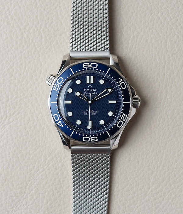 Launched in 2022, to celebrate 60 years of James Bond, this 42mm Seamaster Diver 300M in stainless steel, has a blue oxalic anodized aluminium dial, with laser engraved waves, inspired by the Seamaster Diver 300M worn by James Bond in 1995’s GoldenEye. A commemorative 60 replaces the diving scale’s traditional inverted triangle.
