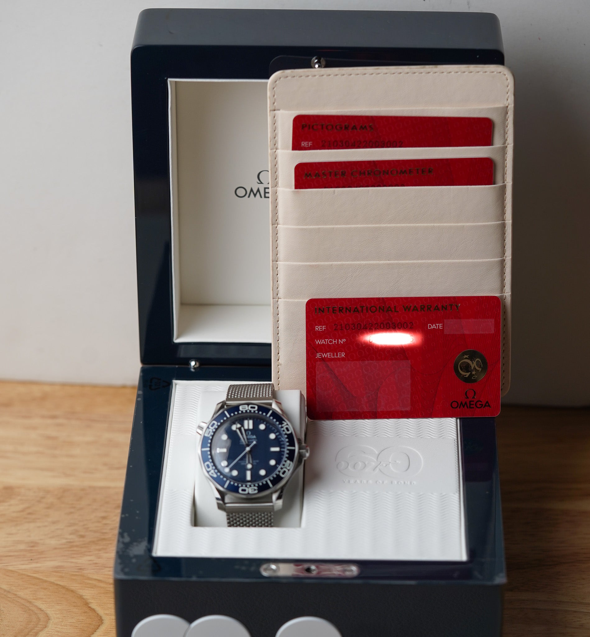 The watch is presented in a blue wooden box decorated in the original Diver 300M pattern, with three dots inspired by the classic Bond movie opening sequence, including a secret push button on the right.