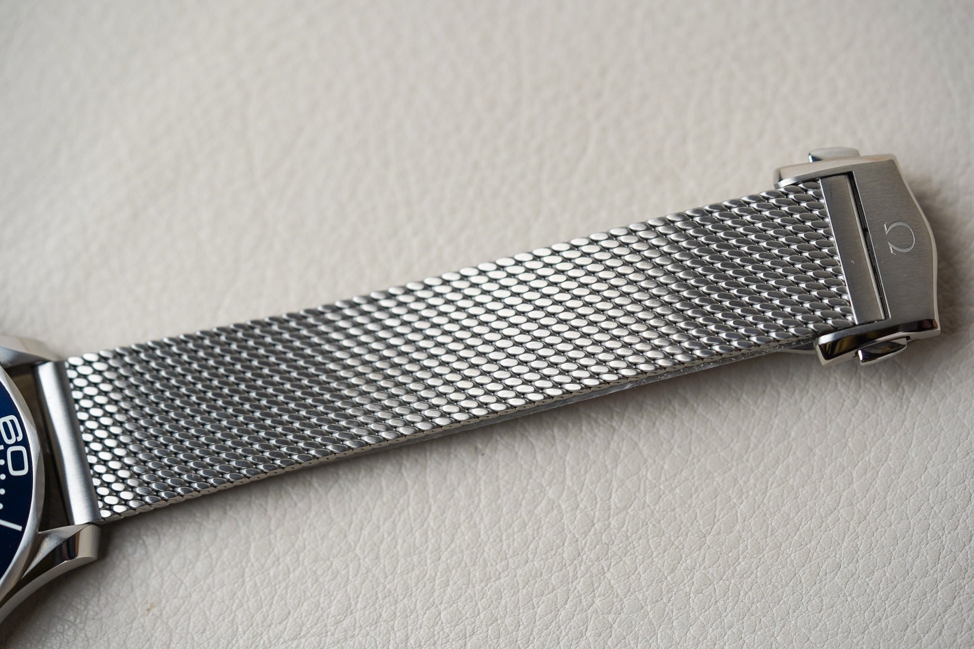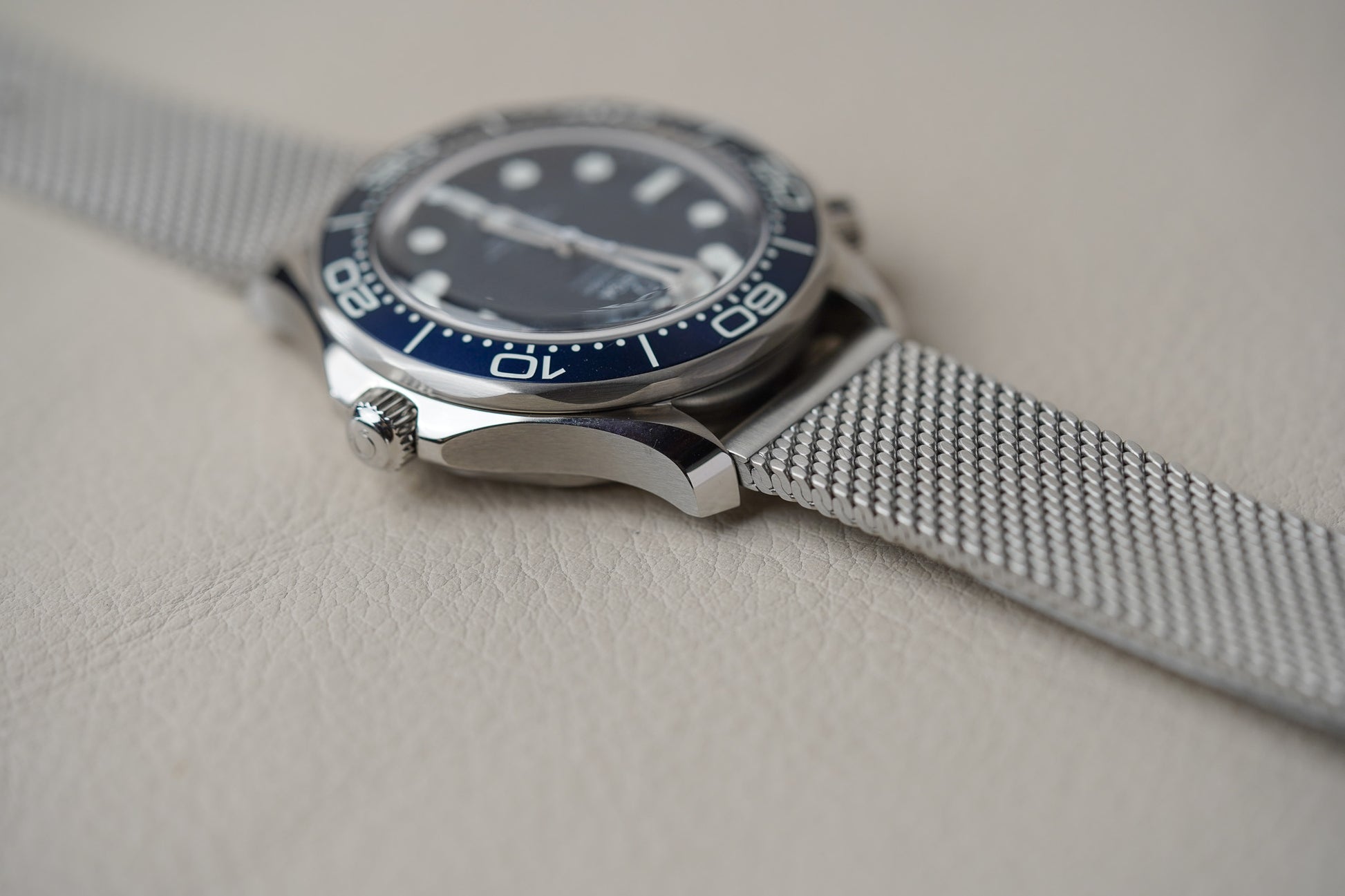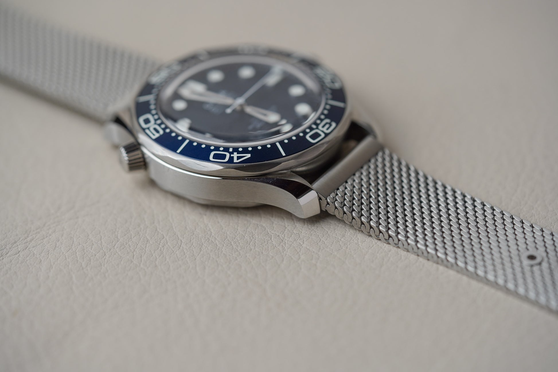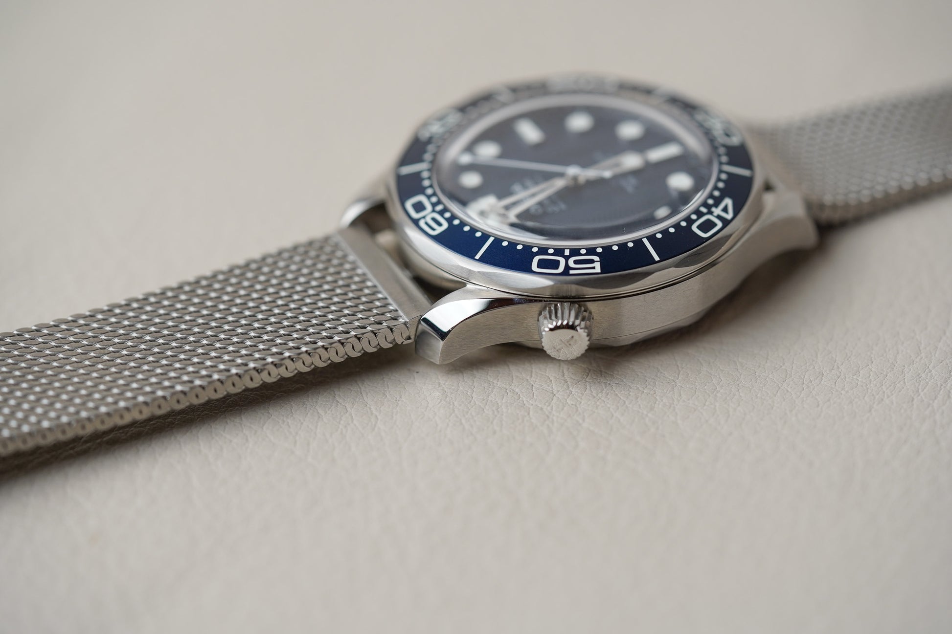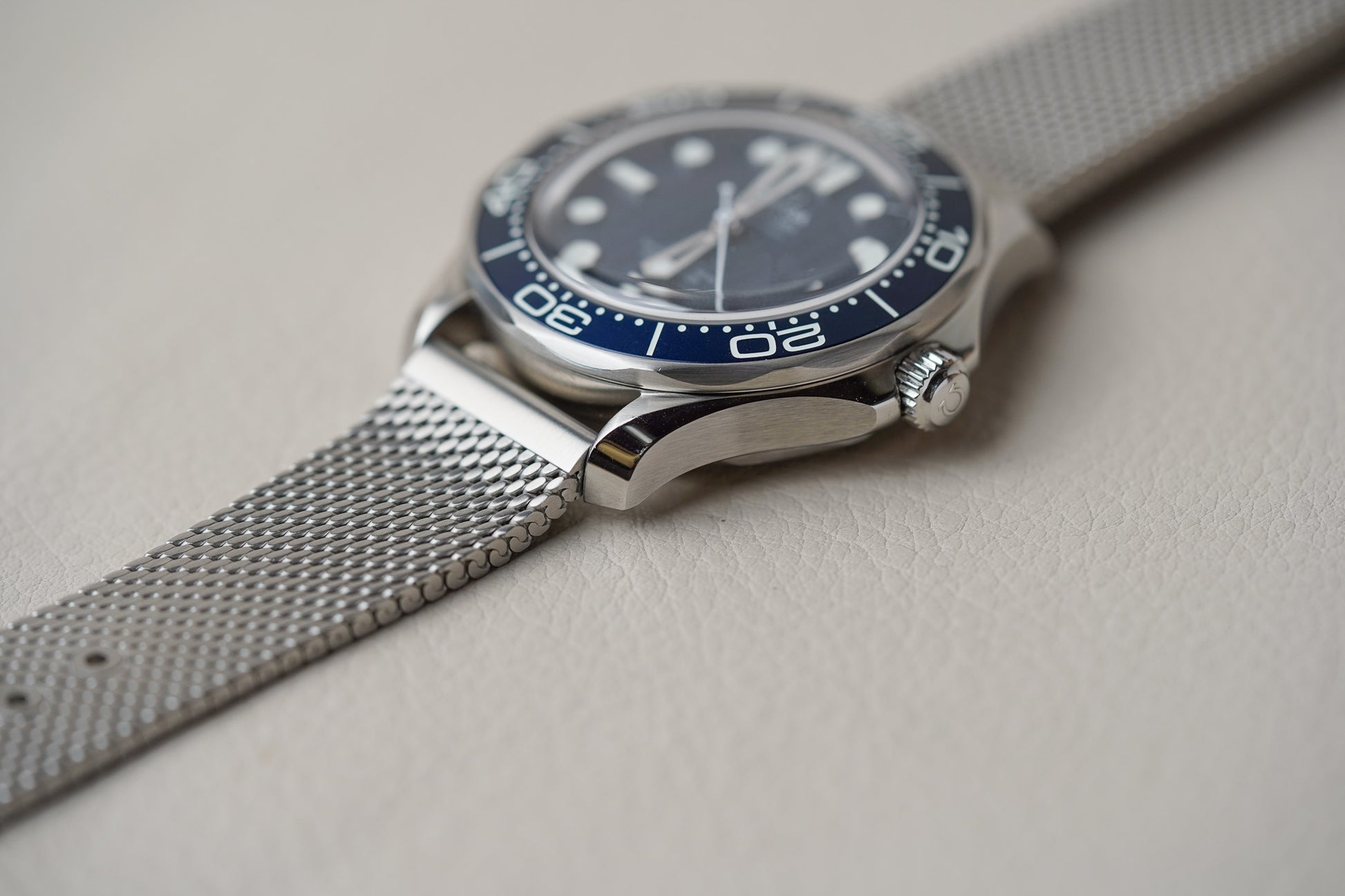 Adding texture to the metallic look is a brushed stainless steel bracelet, in the same elegant mesh style as Bond’s titanium watch in No Time To Die.