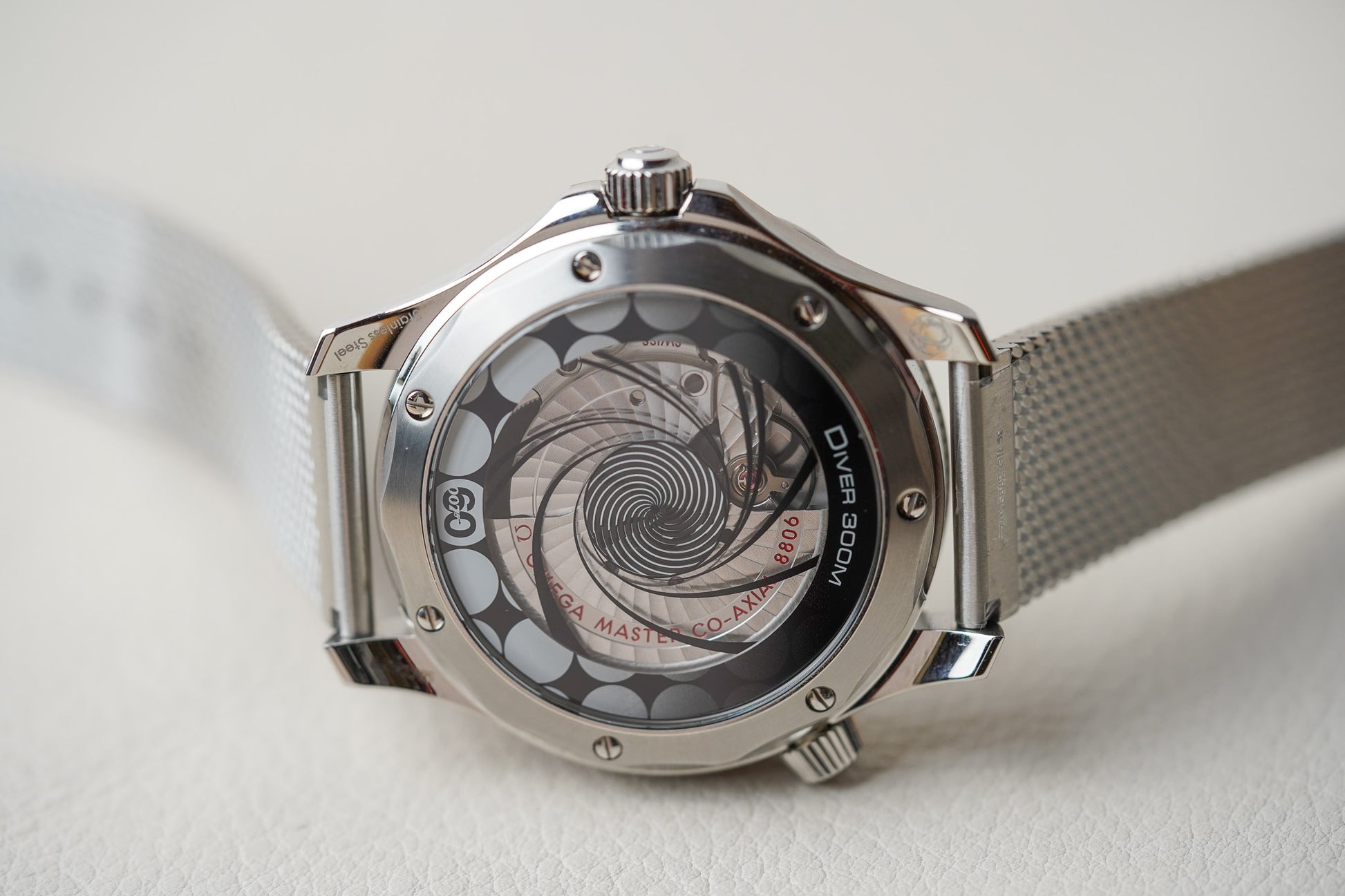 The iconic movie opening sequence, featuring Bond in silhouette and spinning gun barrel, plays out on the caseback, beneath a sapphire crystal decorated with micro-structured metallisation. The “moiré” effect animation is linked to the spinning of the lollipop seconds hand.