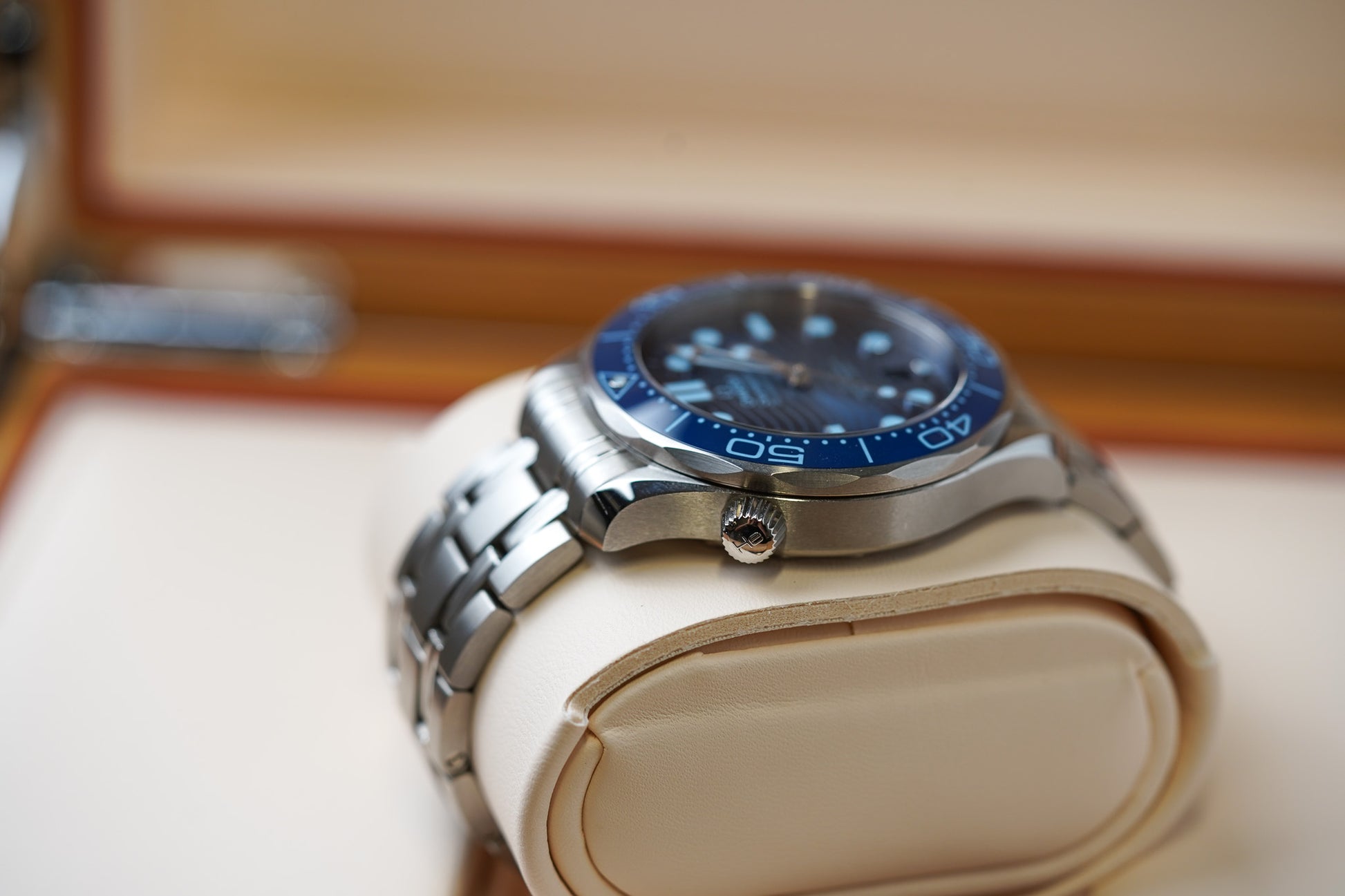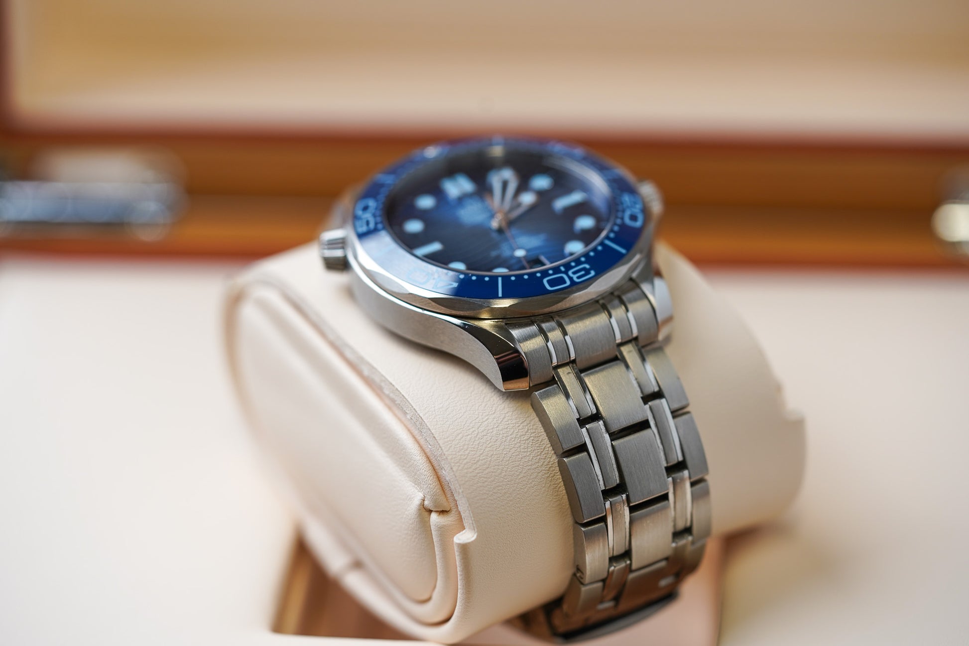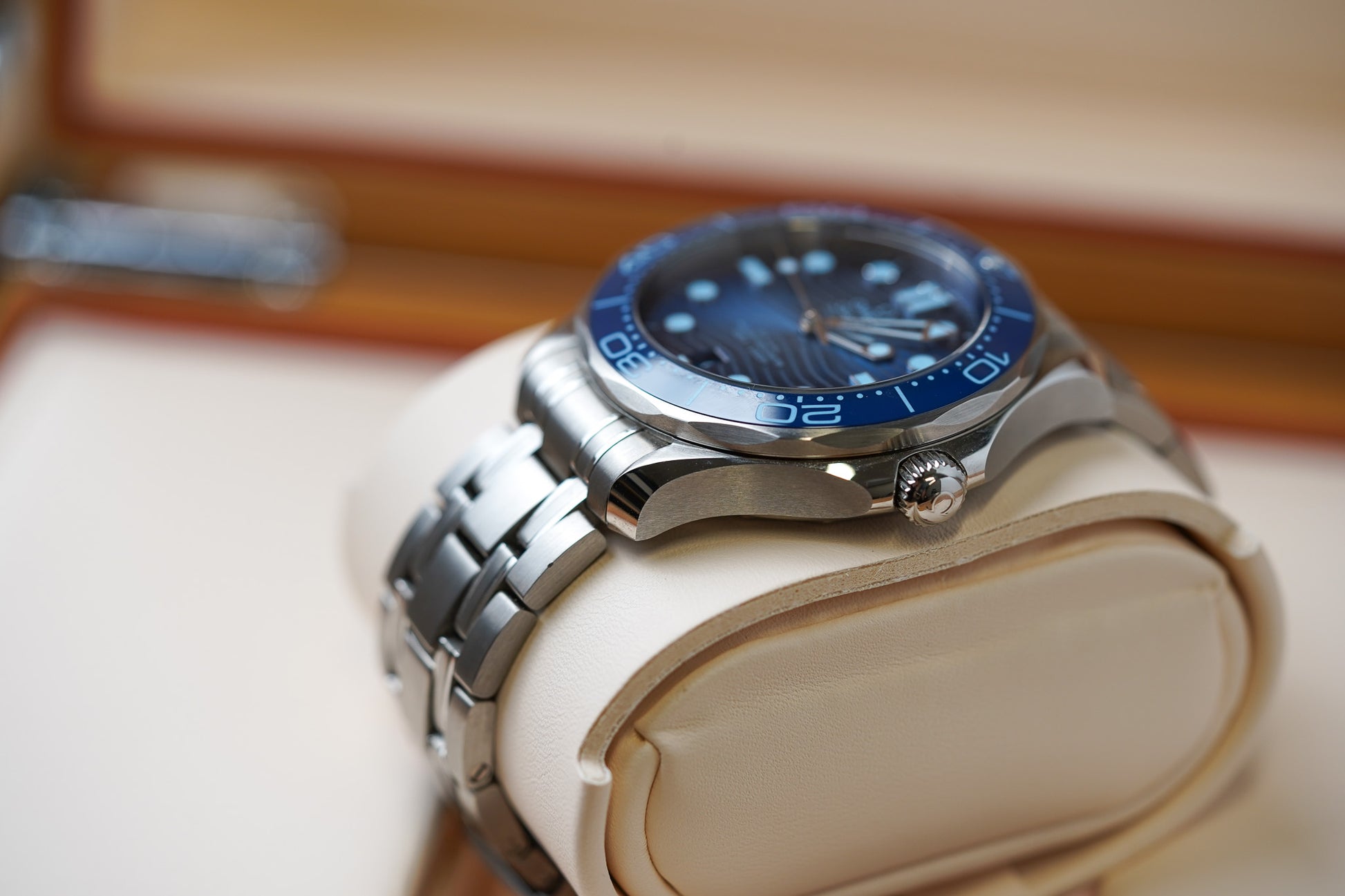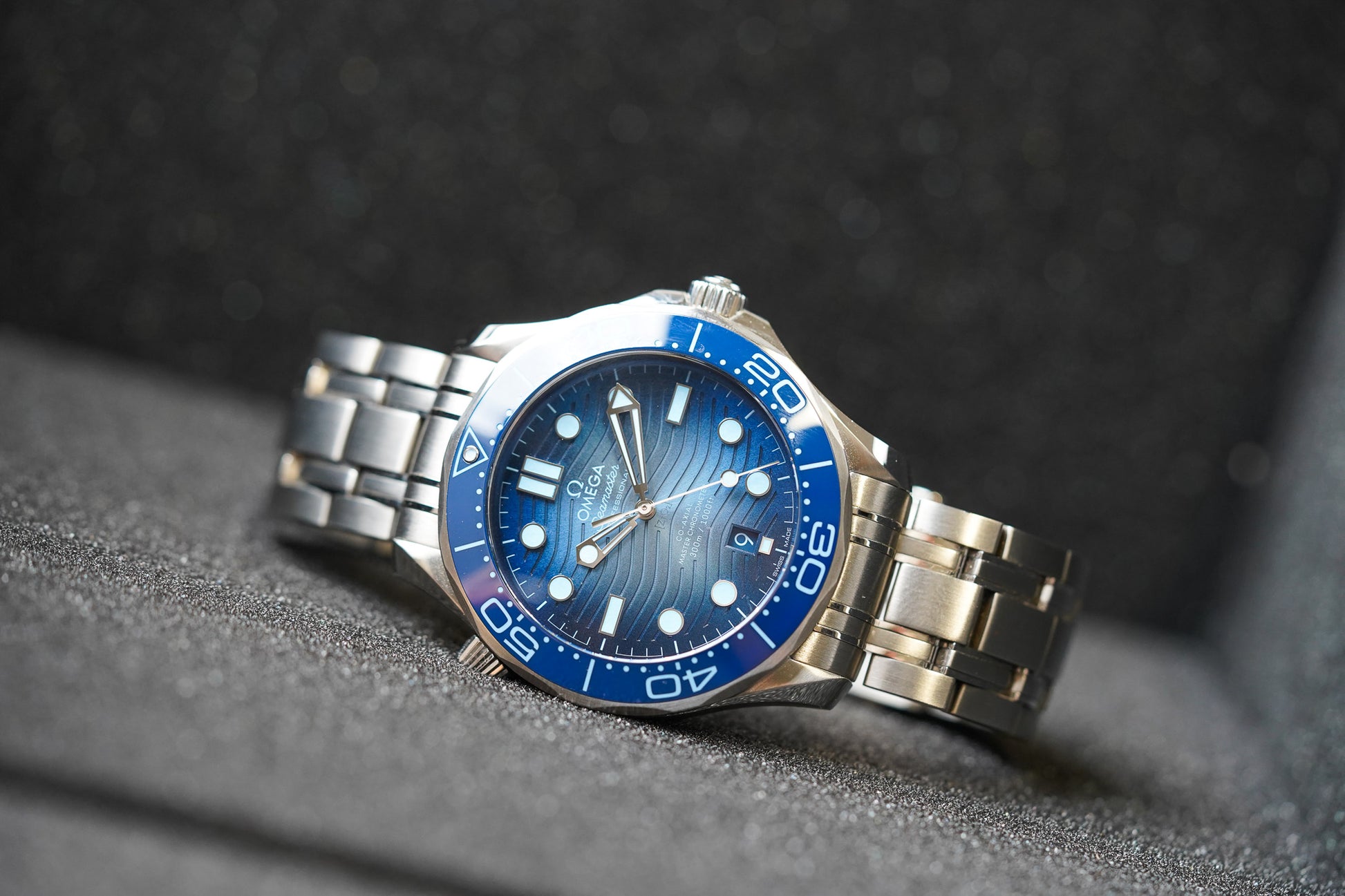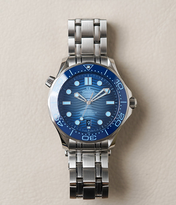 This 42 mm Seamaster Diver 300M has a case and bracelet in stainless steel. The ceramic dial, in OMEGA’s own Summer Blue, is PVD-treated and has a gradient finish to reflect the watch’s level of water resistance. It also includes the 300M’s famous wave pattern.