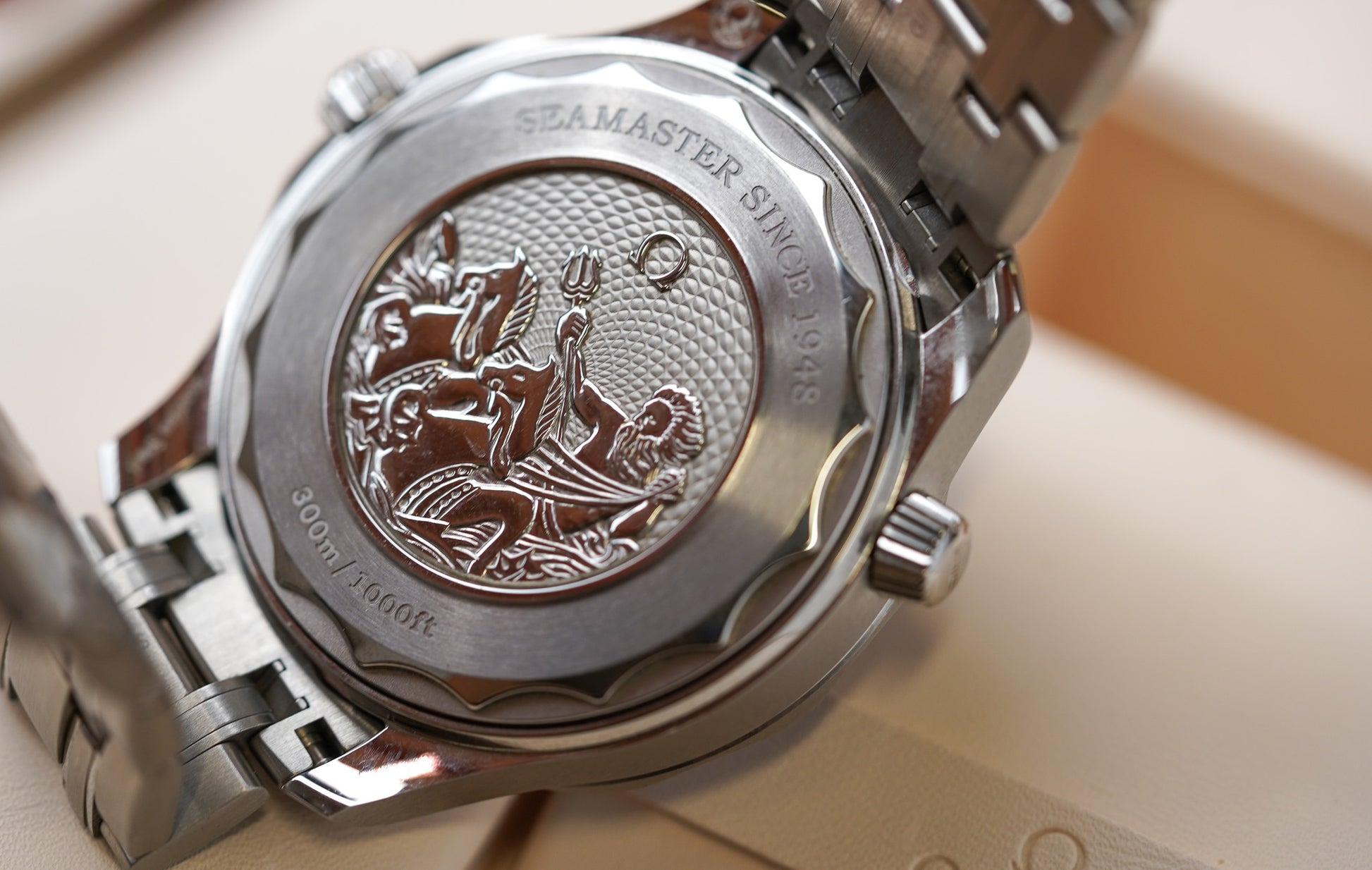 Turning the watch over reveals a stamped commemorative Seamaster logo depicting a trident-bearing Poseidon and two seahorses: OMEGA’s 1956 original and the brand’s current design. Behind which sits OMEGA’s Co-Axial Master Chronometer calibre 8800, certified at the industry’s highest level by the Swiss Federal Institute of Metrology (METAS).