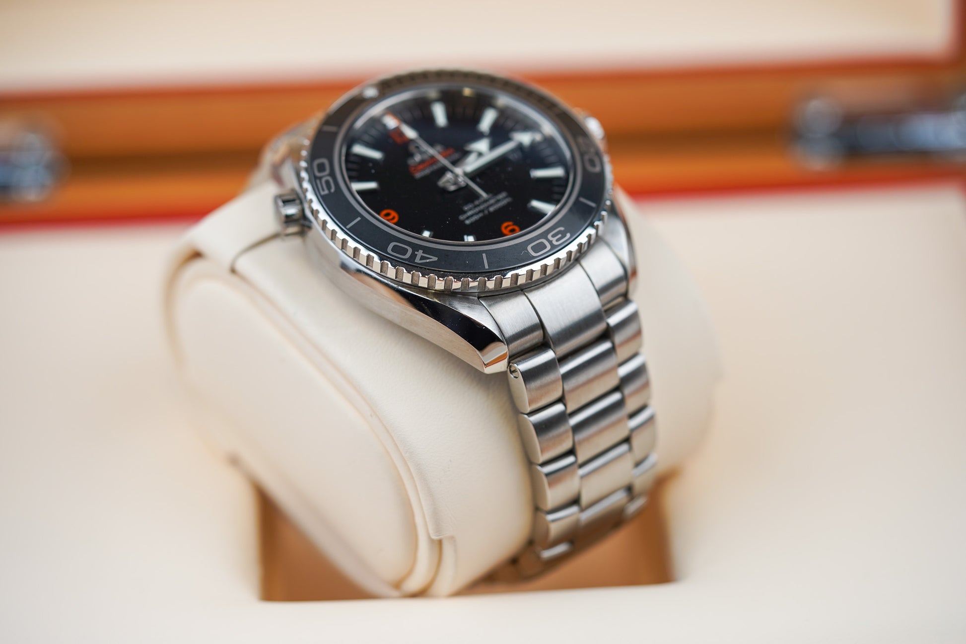 The OMEGA Seamaster Planet Ocean 600M is water resistant to 600 metres / 2000 feet / 60 bar, and has a helium-escape valve. The OMEGA Co-Axial calibre 8500 at the heart of this certified chronometer timepiece can be seen through the transparent caseback.
