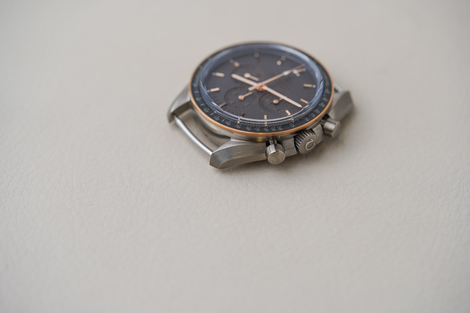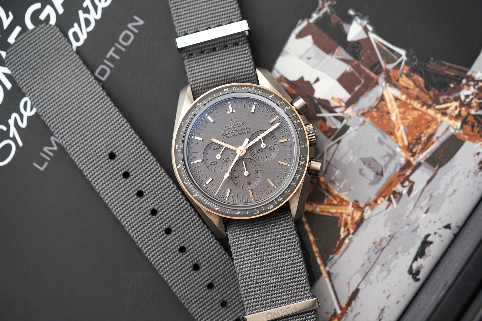 A special laser is used to remove the material surrounding the design elements on the watch's face. The 18K OMEGA Sedna™ gold bezel is enhanced by a matt black ceramic ring with a tachymeter scale, a defining design element of the Speedmaster collection. The 42 mm brushed grade 2 titanium case is presented on a brown coated nylon fabric NATO strap.