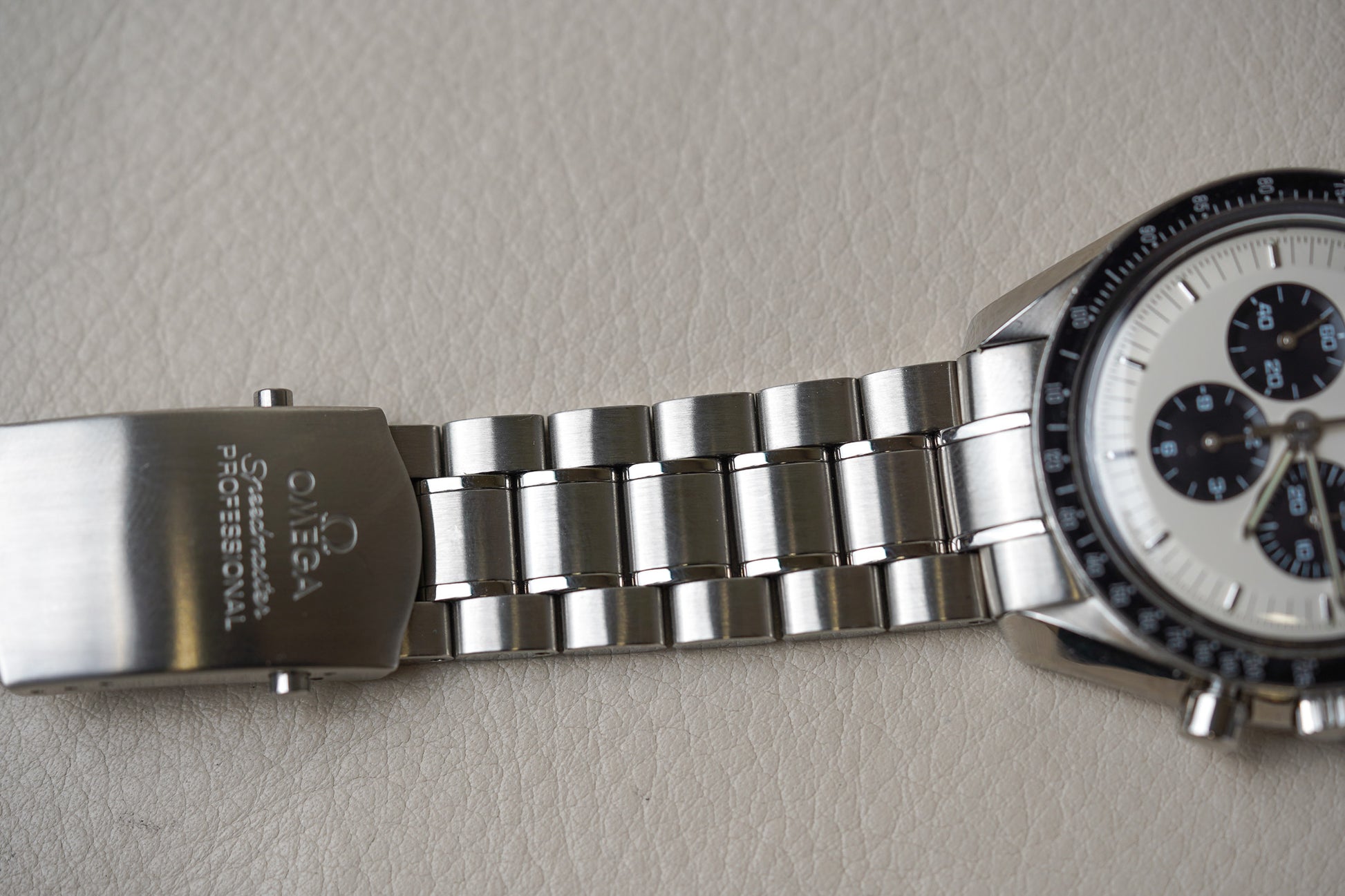 The Omega Speedmaster Professional Apollo XI 35th Anniversary Edition (ref. 3569.31) is a striking tribute to the first moon landing in 1969, celebrating its 35th anniversary with a limited production of just 3,500 pieces. Retaining the iconic “Moonwatch” case design, this model stands out with its stunning silver dial contrasted by bold black subdials, giving it the revered "Panda" look—an aesthetic highly sought after by collectors. At the 9 o'clock position, a subtle yet powerful red Apollo 11 mission patch adds a commemorative touch, while the traditional Hesalite crystal and manually wound Caliber 1861 movement honor the original Speedmaster worn on the moon.