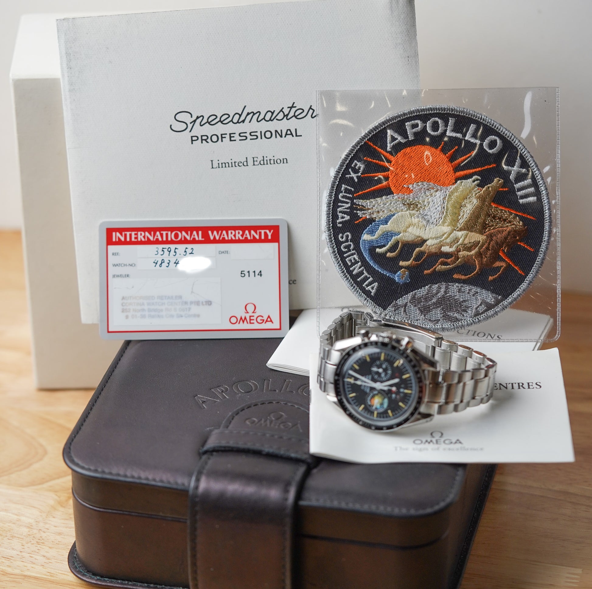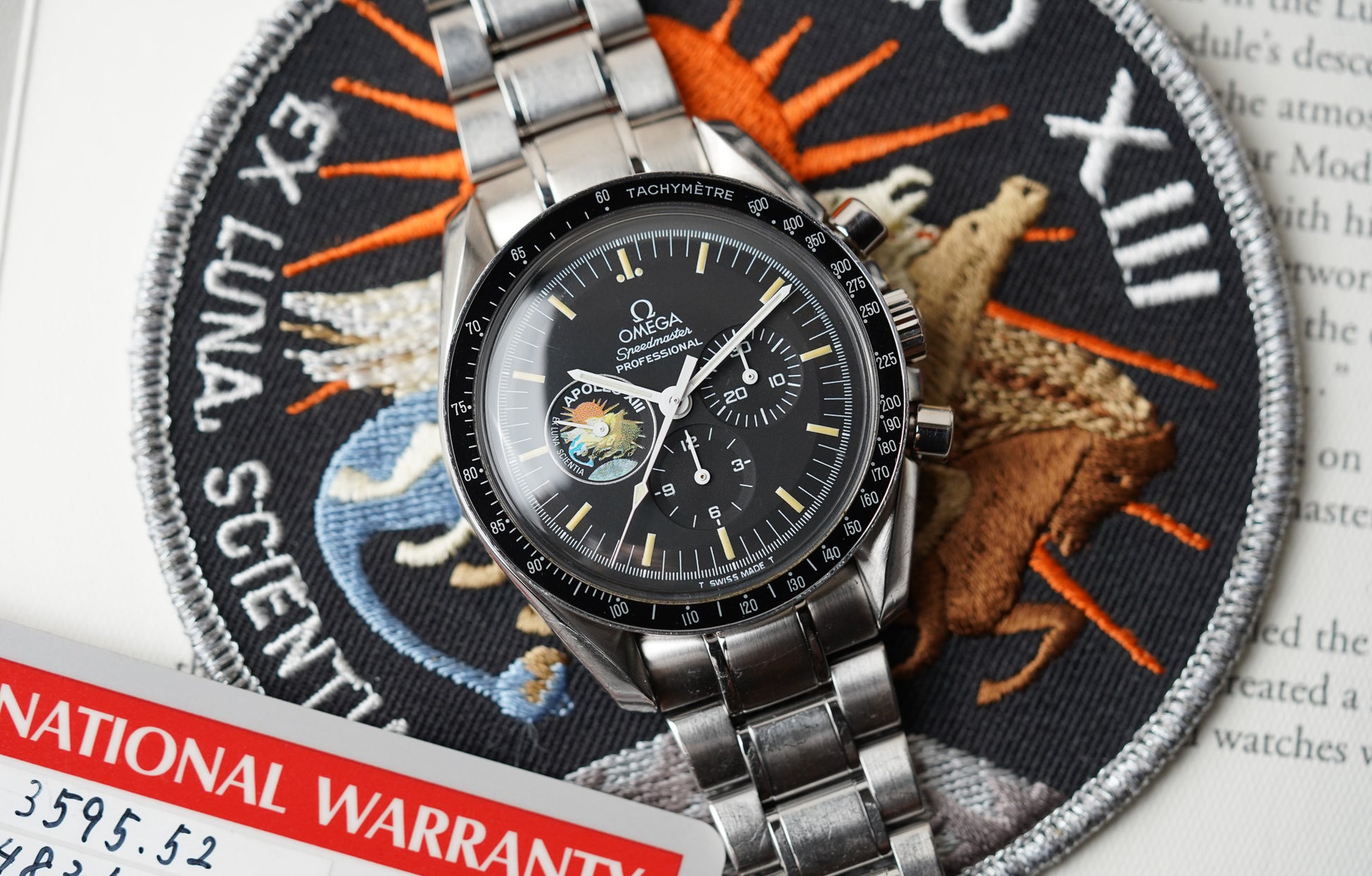 Like many special editions or limited editions at the time, the Speedmaster Professional 3595.52 Apollo XIII came in this flat square black leather box. A bit more flat than the red leather Omega boxes at the time. They also do not seem to decay as the red leather boxes tend to do. I have several red leather Omega boxes from the 1990s and it is not a pretty sight. On top of the black box, you will see the “APOLLO XIII” wording embossed in the leather. Insides there is a warranty booklet (world wide service center overview) as well as the instruction book for the caliber 861 movement. Then there is the plastic credit card format warranty card, with the reference number (3595.52.00) and serial number (mine starts with 48,xxx,xxx) a date and dealer stamp. In the box you should also find the fabric Apollo 13 mission patch. I wonder if anyone sewed it onto their jacket, I am afraid so to be honest. Then there is the authenticity certificate, which it really isn’t to be exact. It has a bit of documentation (mine is in German) on the Apollo 13 mission as well as on the watch, stating that it is a limited edition of 999 pieces. But no specific number (234) or signature to confirm it is authentic like we’ve seen on some of the other limited edition Speedmaster Professional watches. It is a nice “extra” though.