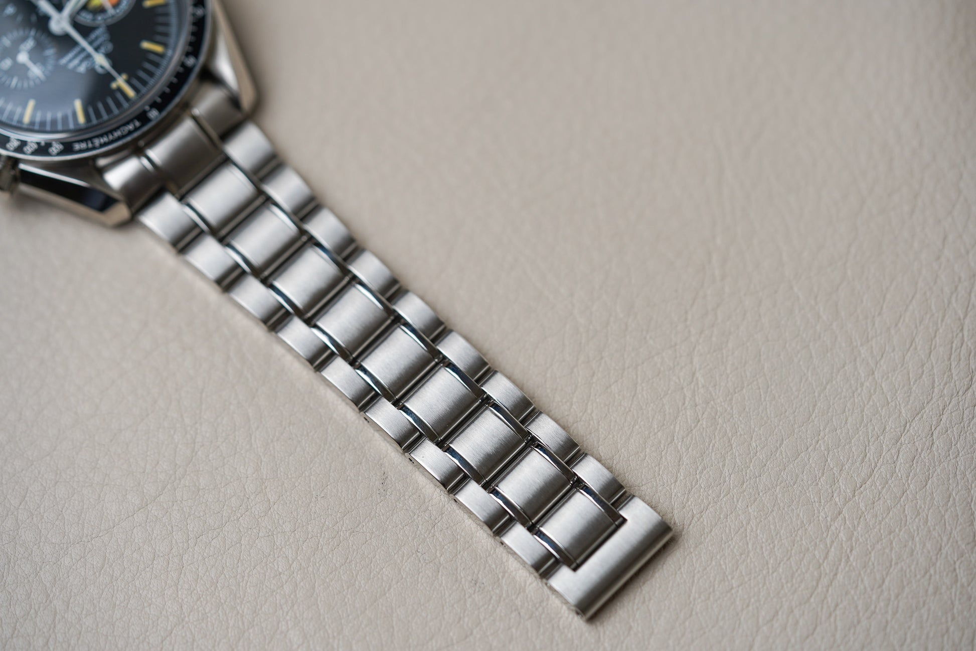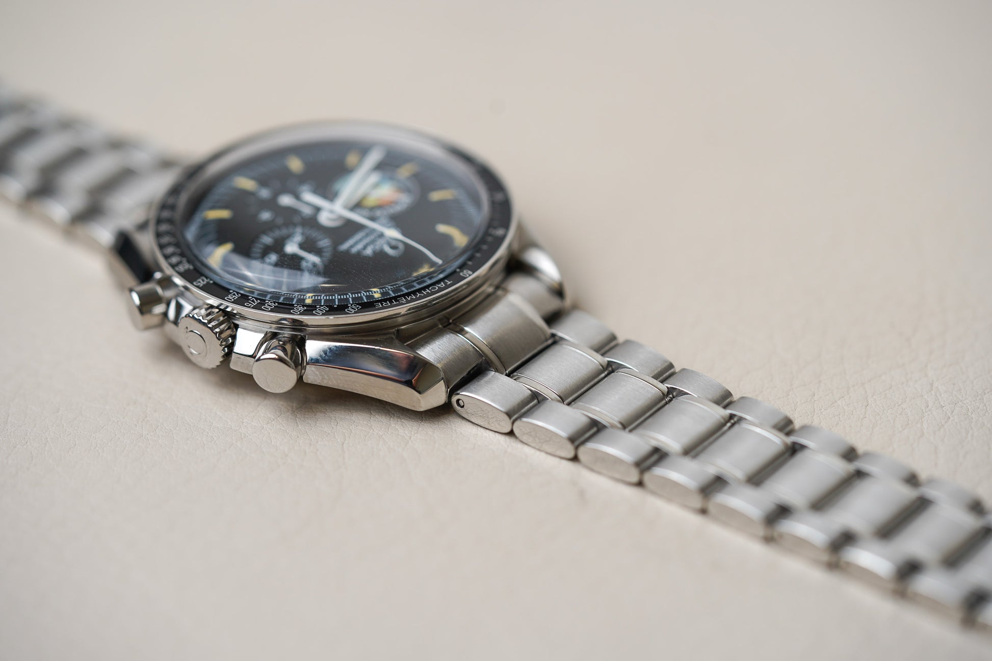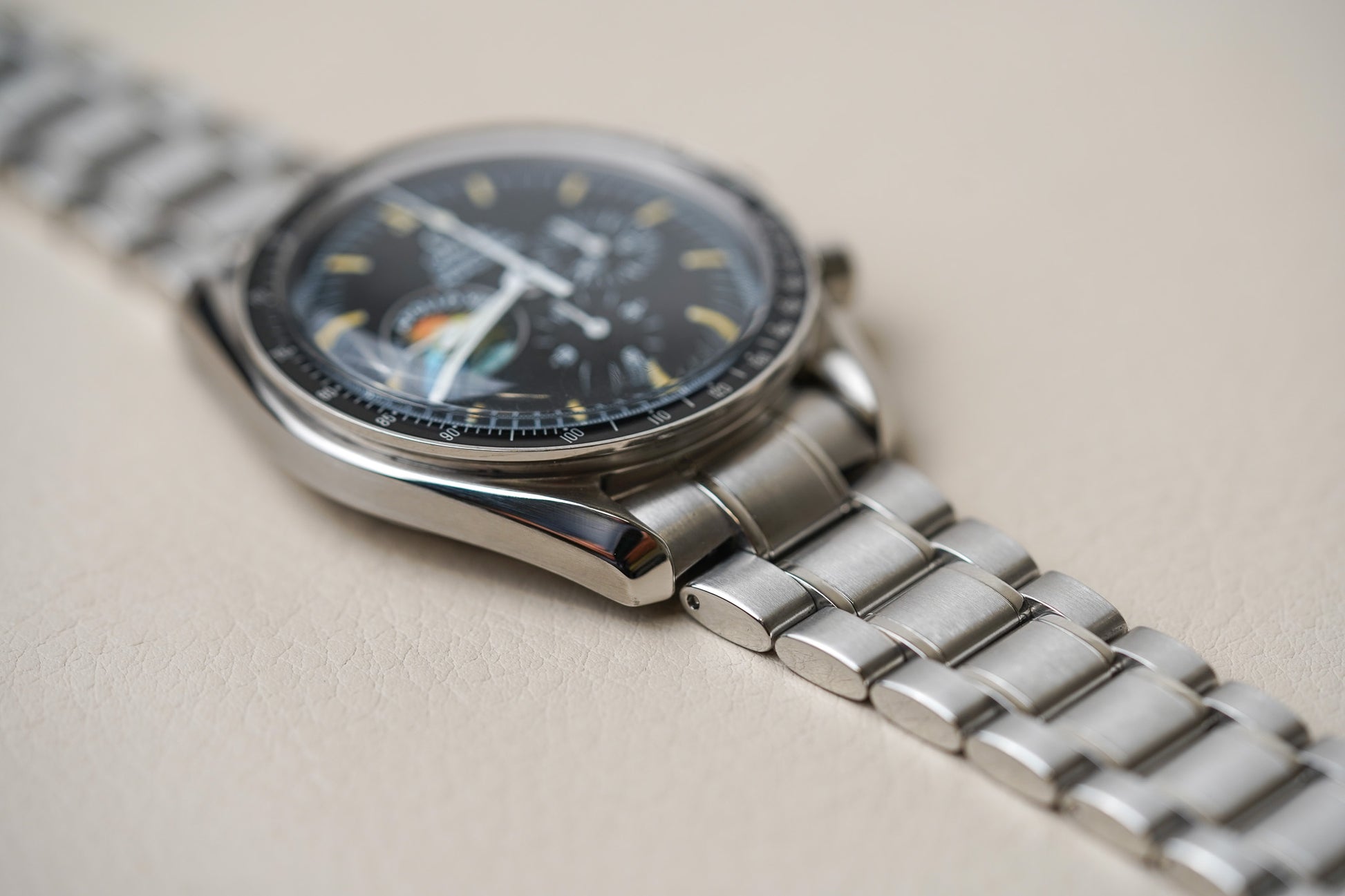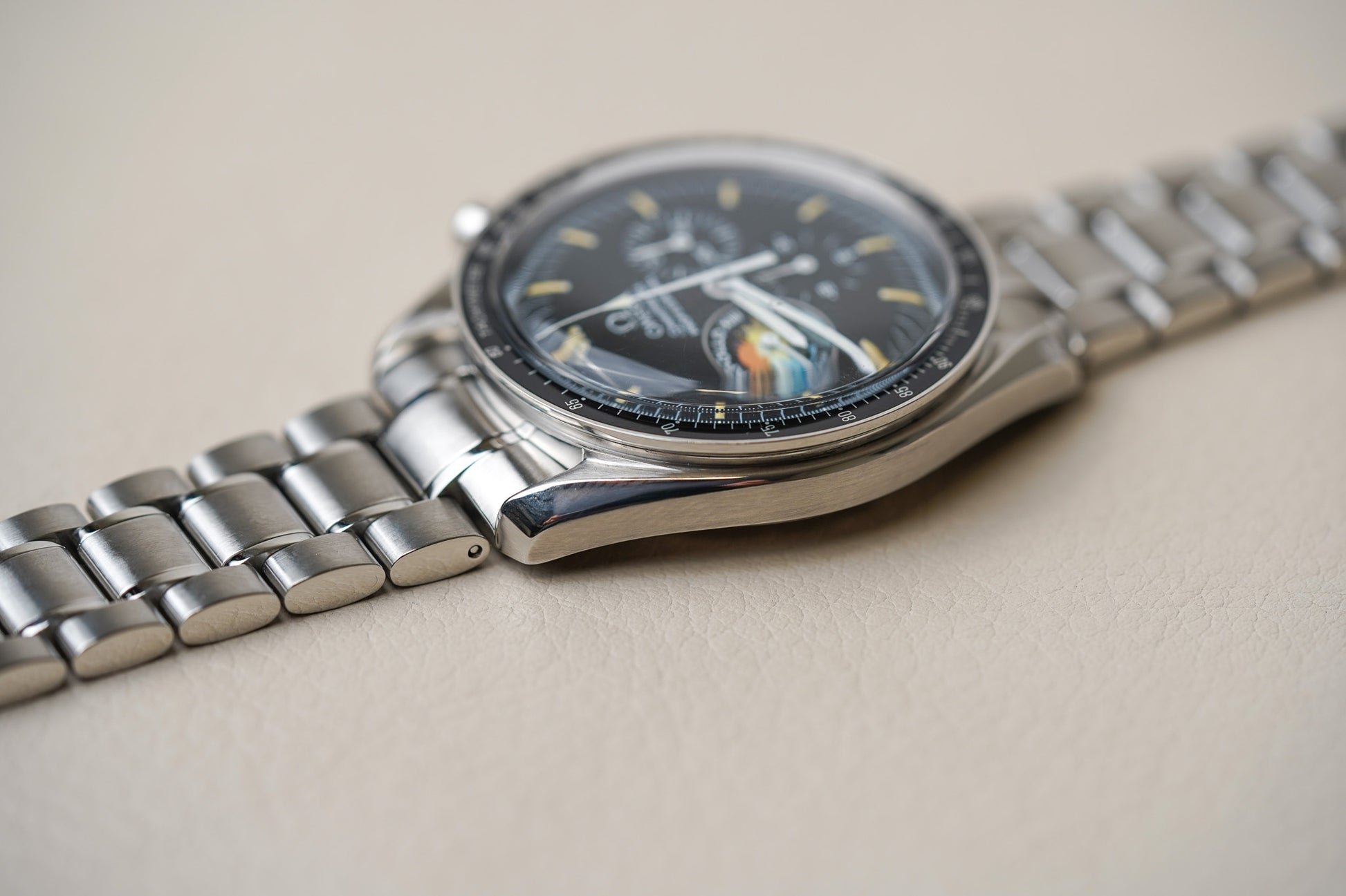 In 1997 and 1998, Omega did 40 Mission Cases with 23 Speedmaster watches each, and an additional 2x 5 of these cases that weren’t supposed to go on the market (but some of them did). In these Mission Cases, there was also a similar Speedmaster Professional 3595.52 Apollo XIII model, but with the later ref.1499 bracelet. So I guess there are 1049 in total of these Apollo XIII mission patch Speedies. These 50 additional Apollo XIII Speedmasters have a Super LumiNova dial and hands. This 1995 model should come on a reference 1479 bracelet. It is quite a hair puller to be honest, but I love the look of the bracelet a lot. It tapers nicely towards the clasp and is not as smooth and shiny as the later bracelet references.
