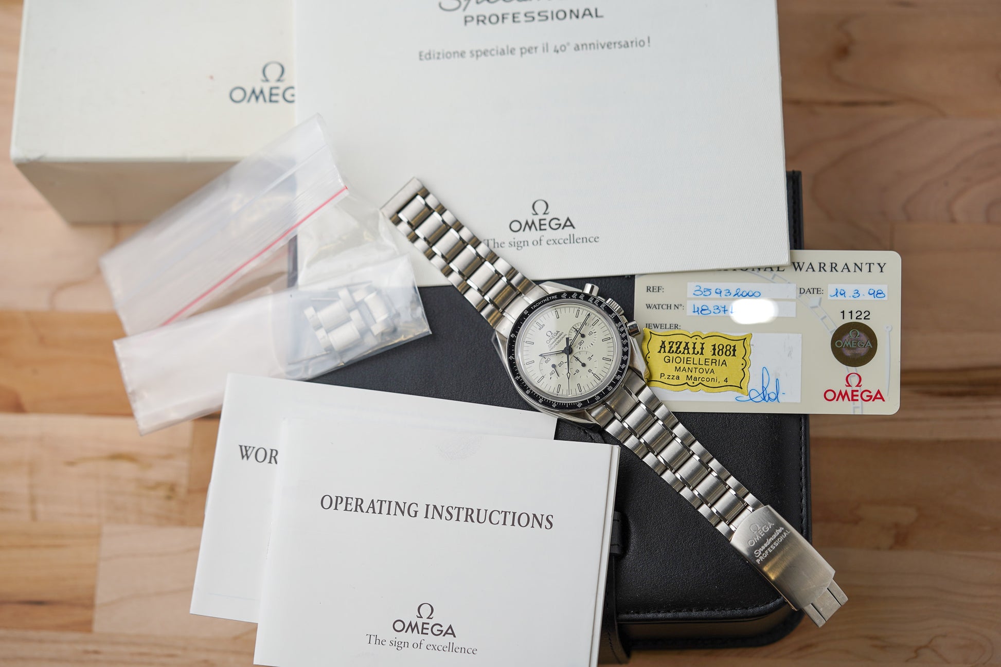 This watch comes with original numbered paper, warranty card, booklets, and boxes.