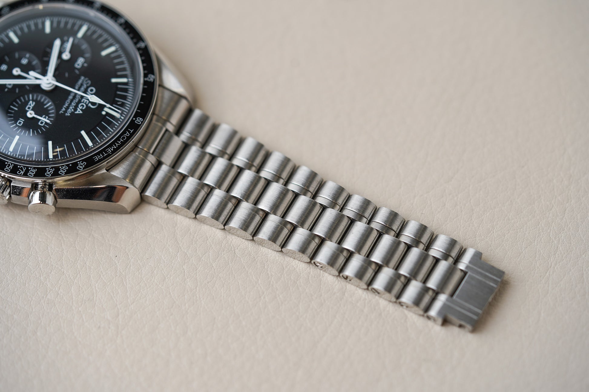 Presented on a brushed five-arched-links-per-row bracelet, this 42 mm Moonwatch in stainless steel features hesalite glass on the front and an embossed Seahorse medallion on the caseback. Inspired by the 4th generation Speedmaster style worn on the moon, it also includes an asymmetrical case, black step dial and the famous dot over 90 on the anodised aluminium bezel ring.