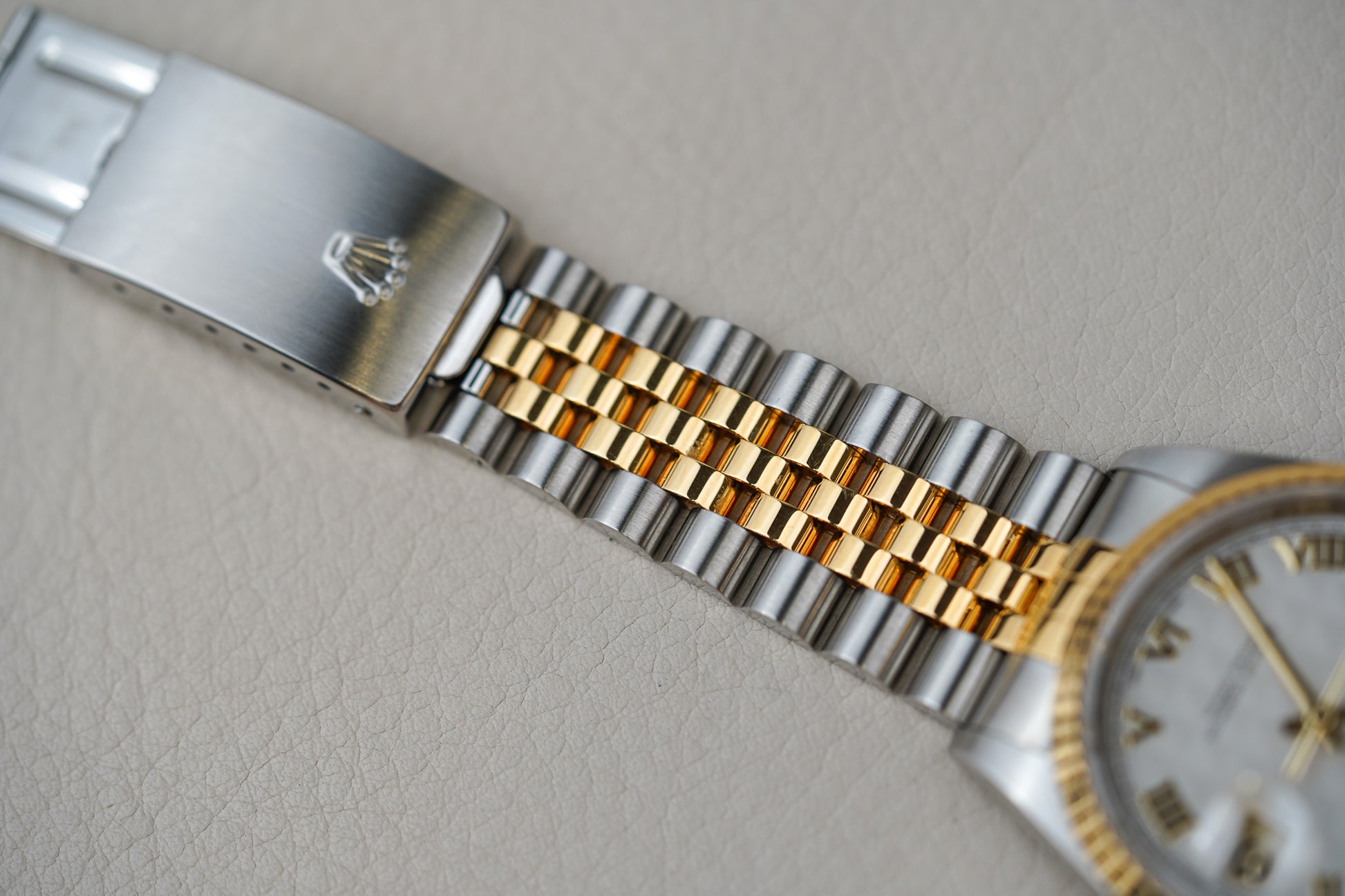 The Rolex Datejust 16233 with Ivory Pyramid Dial is a refined and collectible variant of one of Rolex’s most enduring classic watches, produced from the late 1980s into the mid-2000s as part of the Datejust 36mm two-tone lineup. The reference 16233 combines a 36 mm stainless steel Oyster case with an 18k yellow gold fluted bezel, screw-down Twinlock crown, and a comfortable steel-and-gold Jubilee bracelet, creating the iconic Rolesor aesthetic that defines the Datejust’s timeless versatility. At its heart beats Rolex’s Caliber 3135 automatic movement, a COSC-certified chronometer known for robust precision and reliability with a quickset date function under a Cyclops-magnified window at 3 o’clock.