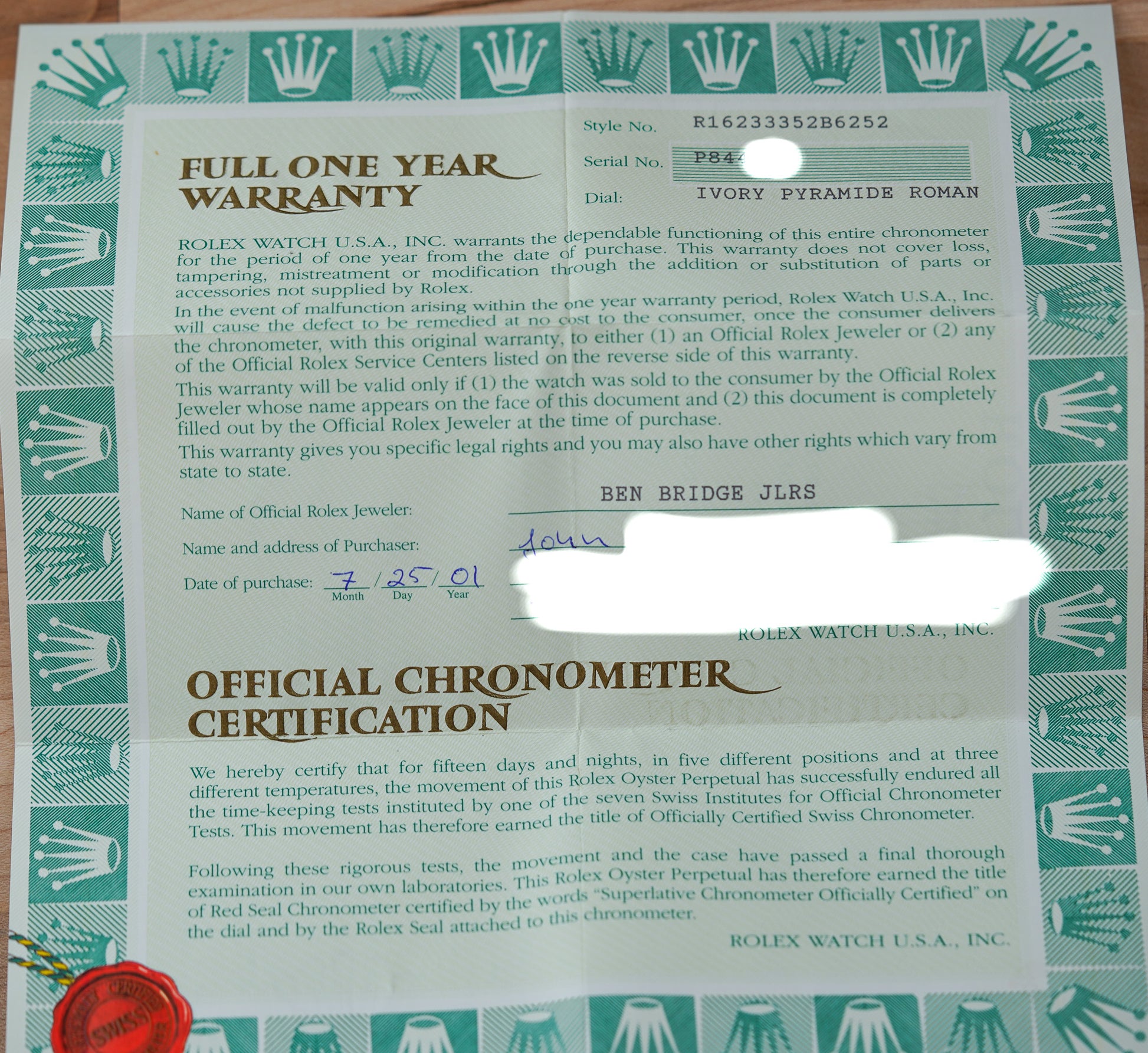 What sets this example apart is its ivory “pyramid” dial—a subtle textured pattern that plays with light and adds visual depth and character, paired with applied 18k gold Roman numerals and matching hands for an elevated yet classic look. This dial variation is less common than standard finishes, giving the watch an extra touch of individuality while still expressing the Datejust’s signature elegance and everyday wearability. With 100 m water resistance and a finish that can move effortlessly from business attire to smart casual, the 16233 Pyramid Dial remains a favorite among collectors and enthusiasts who appreciate both Rolex heritage and distinctive dial artistry.