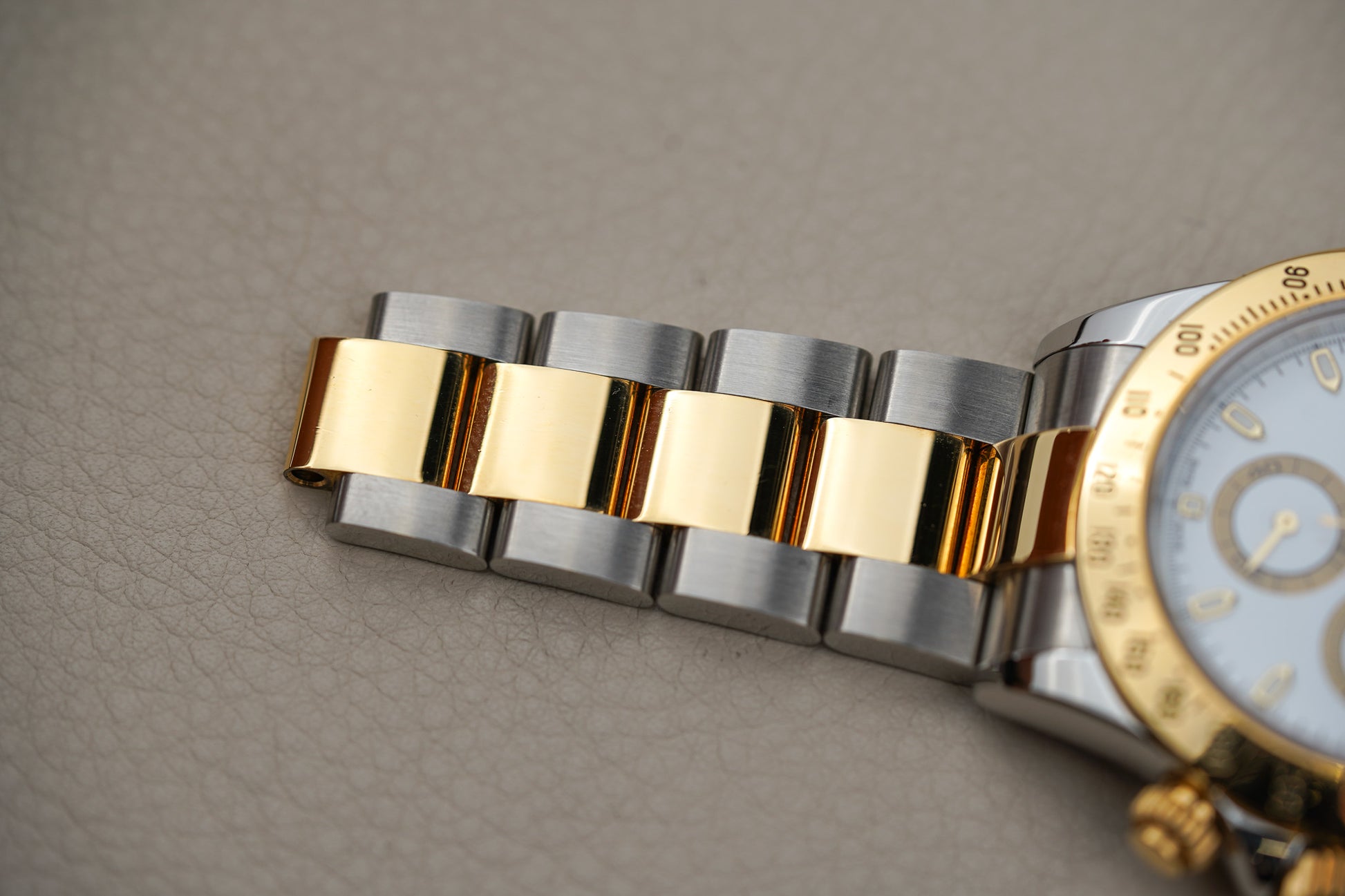 Inside the 116523 beats Rolex’s in-house Calibre 4130 automatic chronograph movement, a Superlative Chronometer (COSC-certified) with about 72 hours of power reserve, a column-wheel chronograph, and Rolex’s Parachrom hairspring for enhanced stability and resistance to shocks and temperature variations. The tachymeter scale on the gold bezel allows precise measurement of average speed over distance — a nod to the Daytona’s racing heritage — while the 100 m water resistance and Oysterlock clasp with Easylink extension ensure practical comfort and durability for daily wear. The Two-Tone 116523 White Dial remains a favorite among collectors who appreciate Rolex’s blend of tool-watch performance and classic luxury styling.