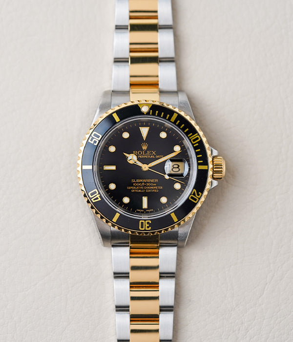 The Rolex Submariner reference 16613 with black dial is a true classic, blending stainless steel and 18K yellow gold in one of the most recognizable sport watch designs ever made. Featuring a 40mm Oyster case, unidirectional black bezel, and the timeless black dial with luminous hour markers, this two-tone Submariner strikes the perfect balance between rugged tool watch and refined luxury. It’s a configuration that defined an era of Rolex—confident, versatile, and unmistakably iconic on the wrist.